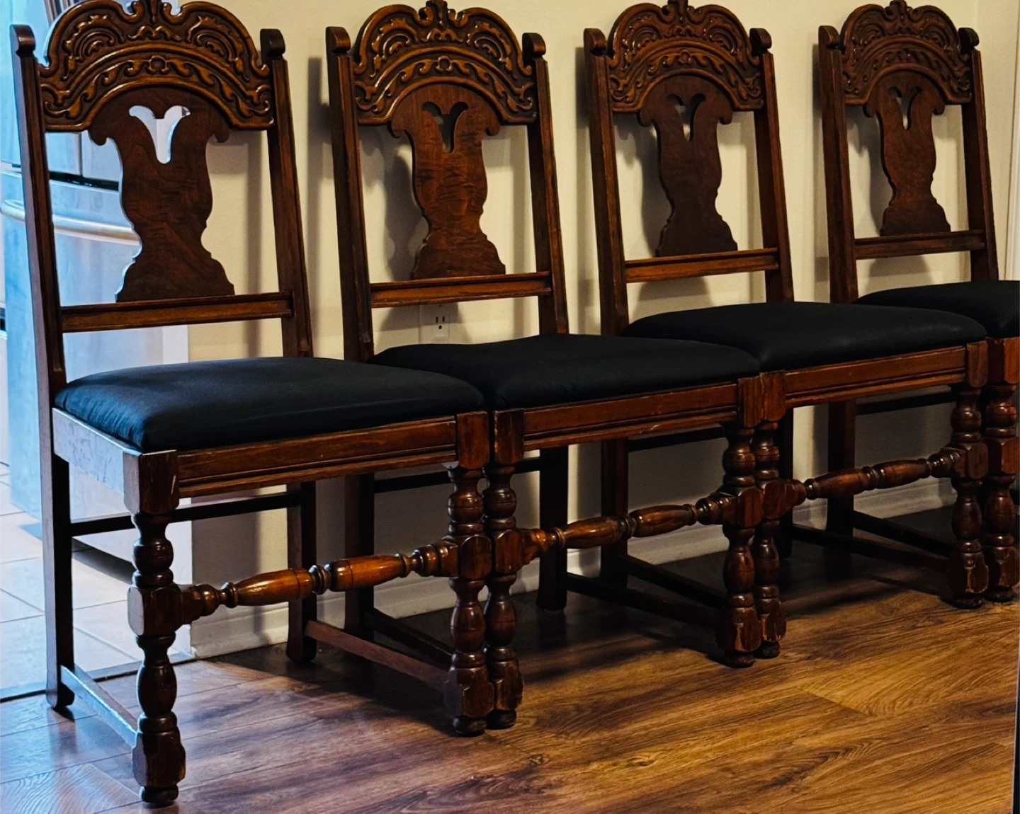 A set of four beautiful antique dining chairs. These chairs feature dark wood with ornate carvings on the backs.