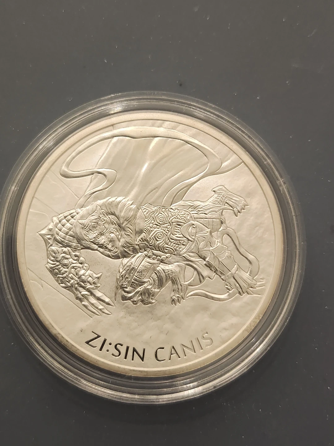 2018 Fine Silver 999 coin from the Republic of Korea. Features "Zi:Sin Canis" design. Made by KOMSCO. It is a semi-numiamatic collectible and artistic design.