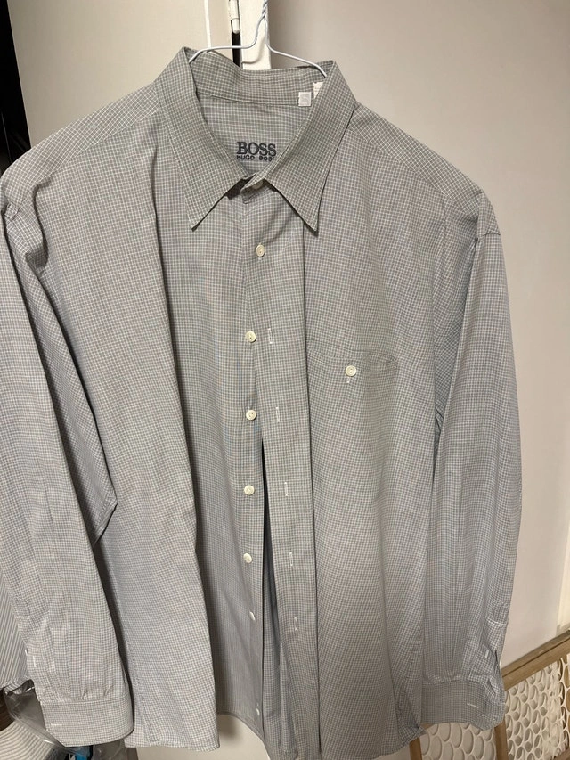 This is a used Hugo Boss dress shirt in good condition, perfect for any business or casual occasion. The shirt features a subtle pattern, long sleeves, and a classic button-down style. It's been well-maintained and is ready to wear. Brand: Hugo Boss, Style: Dress Shirt, Sleeve Length: Long Sleeve, Size: 17.5. Cash accepted.