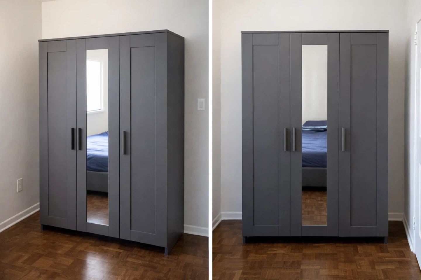 This dark grey wardrobe offers ample storage with four doors, two of which have full-length mirrors. It's a stylish and practical addition to any bedroom! The doors are fitted with sleek, modern handles. It's built for durability and comes in a neutral colour that'll fit most decors.