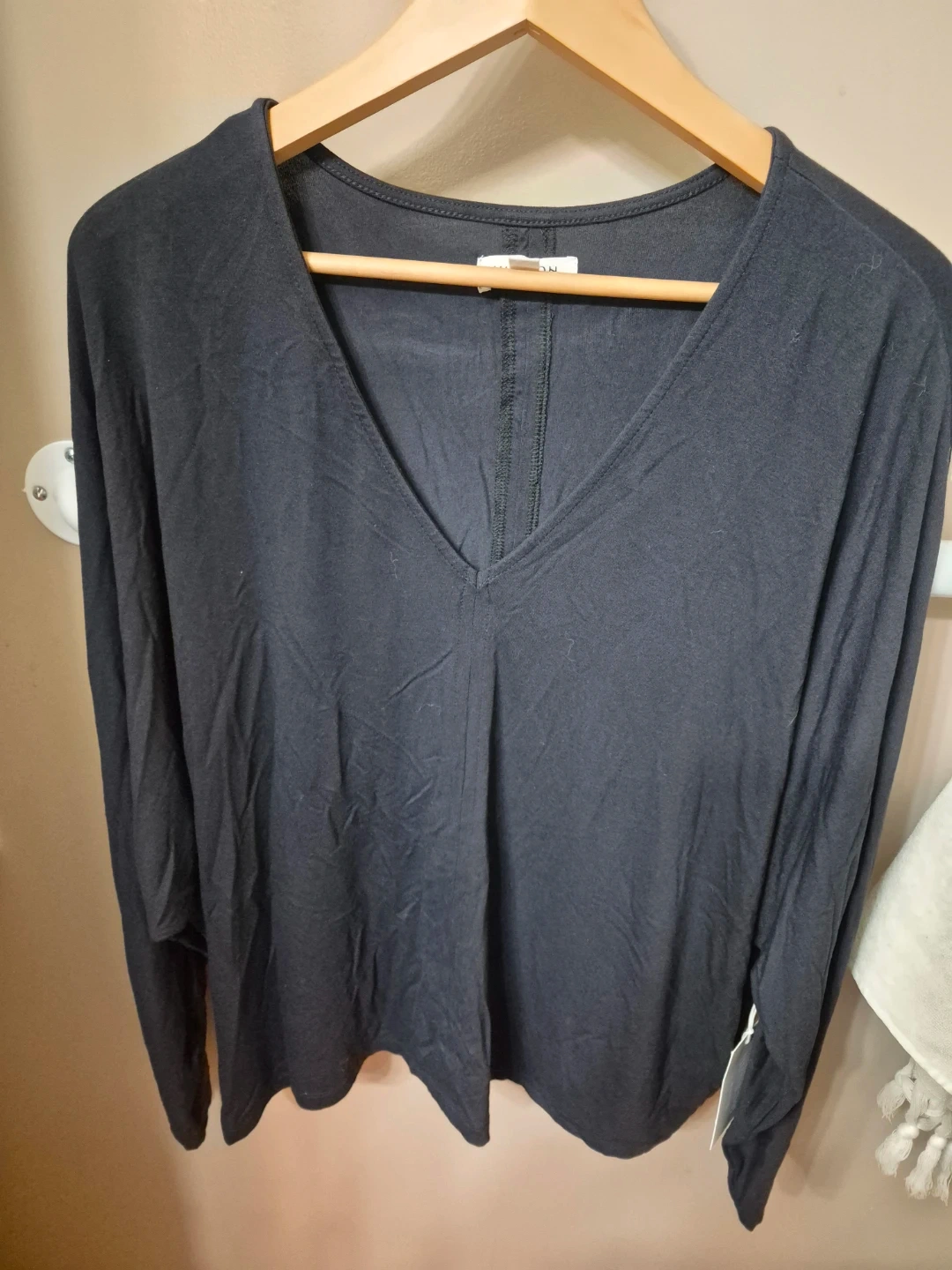 This is a women's black long sleeve top with a V-neck. It's made of a soft, comfortable material. The neckline is designed with a flattering drape.