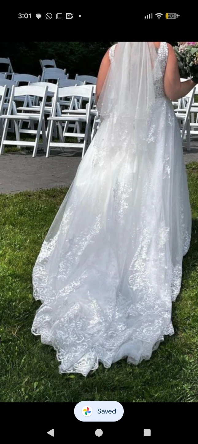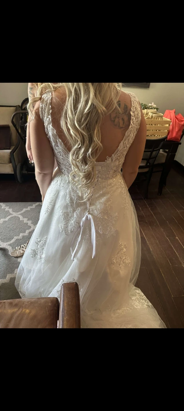 Beautiful white lace wedding dress with a flattering v-neckline and intricate detailing. It features a corset back for an adjustable fit and a stunning train for added elegance. Corset adjustable back and button up train. Needs to be professionally cleaned. Pickup in spruce grove or can meet west edmonton.sized for a women 5'2/5'3 height