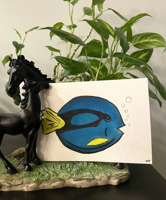 4x6 Watercolor Regal Blue Tang painted by me. Can be framed or used as a greeting card or a postcard. Great for a kids room. Makes a great gift too. Buy 5 (4x6) get 1 free.