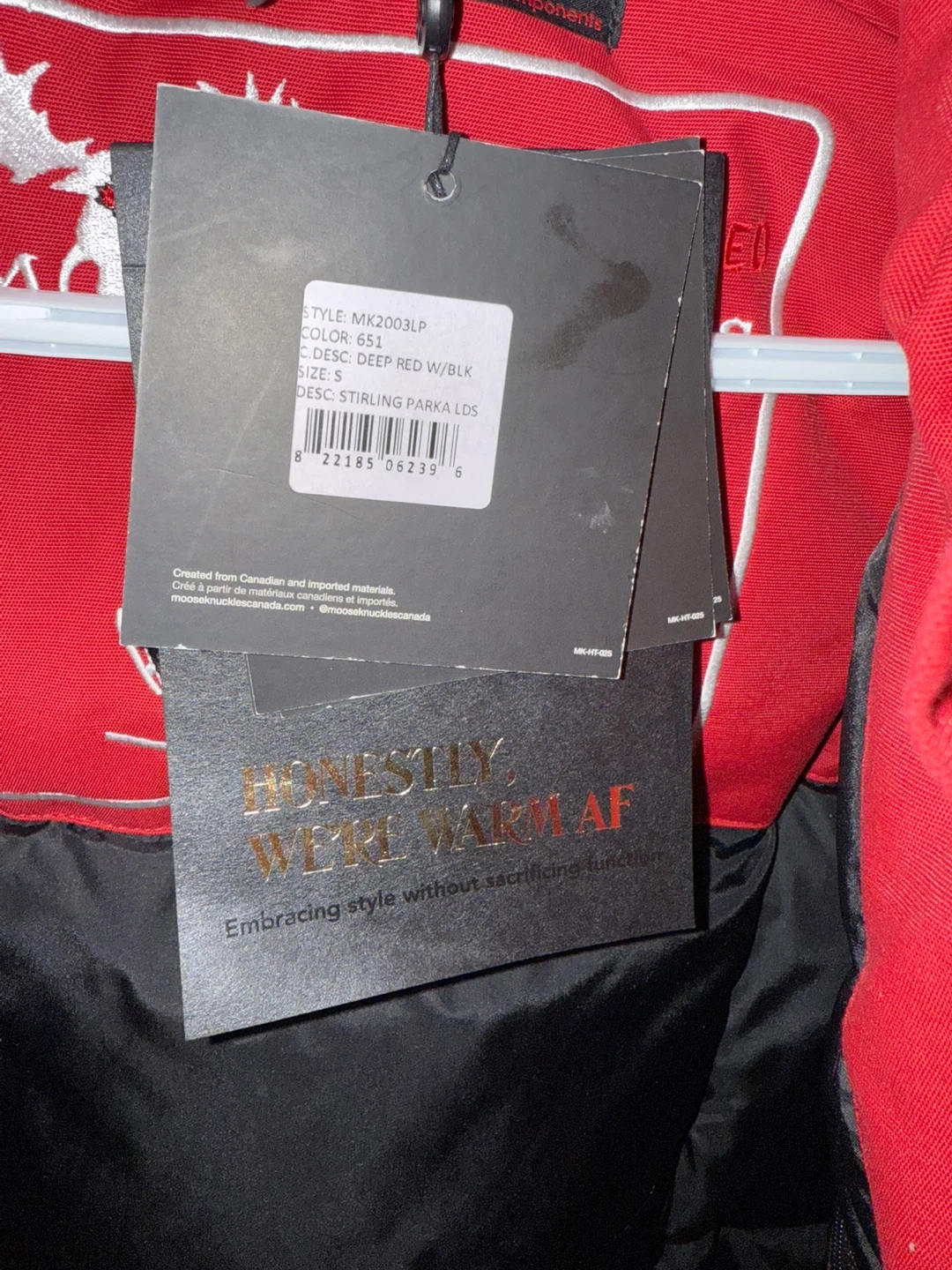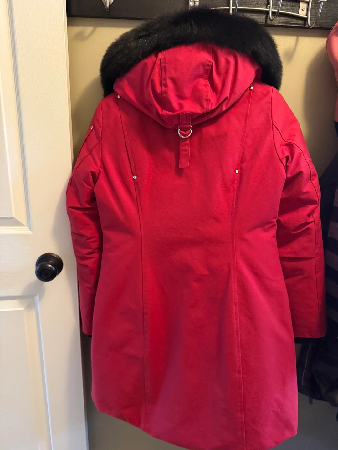 Red Moose Knuckles puffer jacket with black fur trim on the hood. It's designed for cold weather. Jacket has pom-poms on the hood drawstrings.