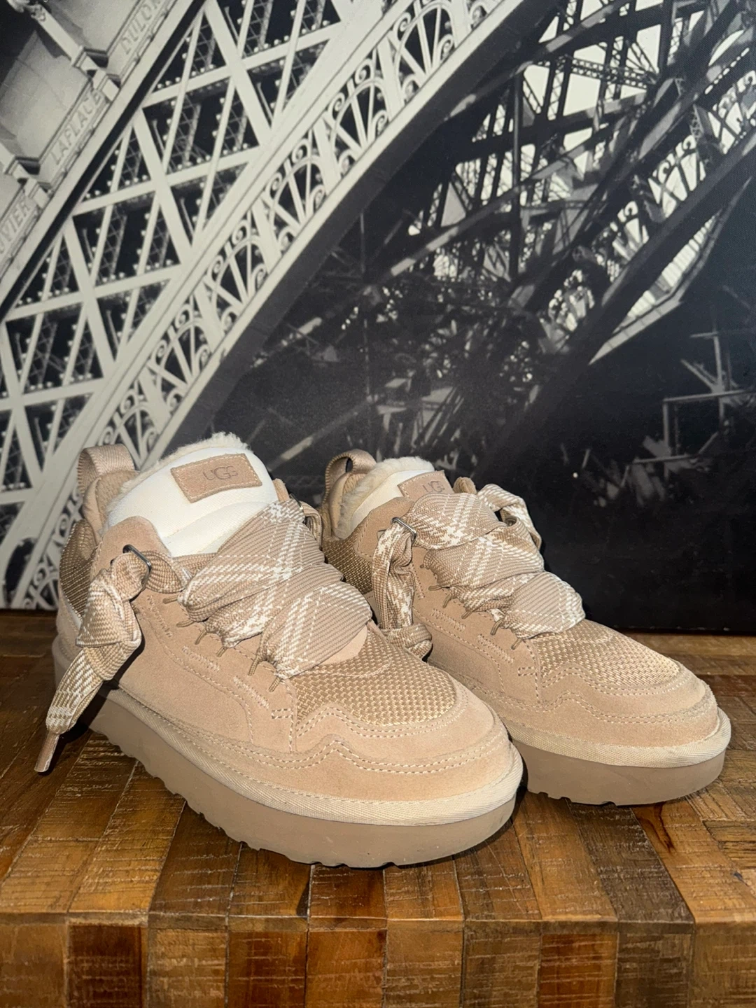 These UGG sneakers are a stylish beige colour. They feature a comfortable suede and mesh upper with fluffy lining. Laces have a decorative pattern. A great casual shoe for everyday wear!