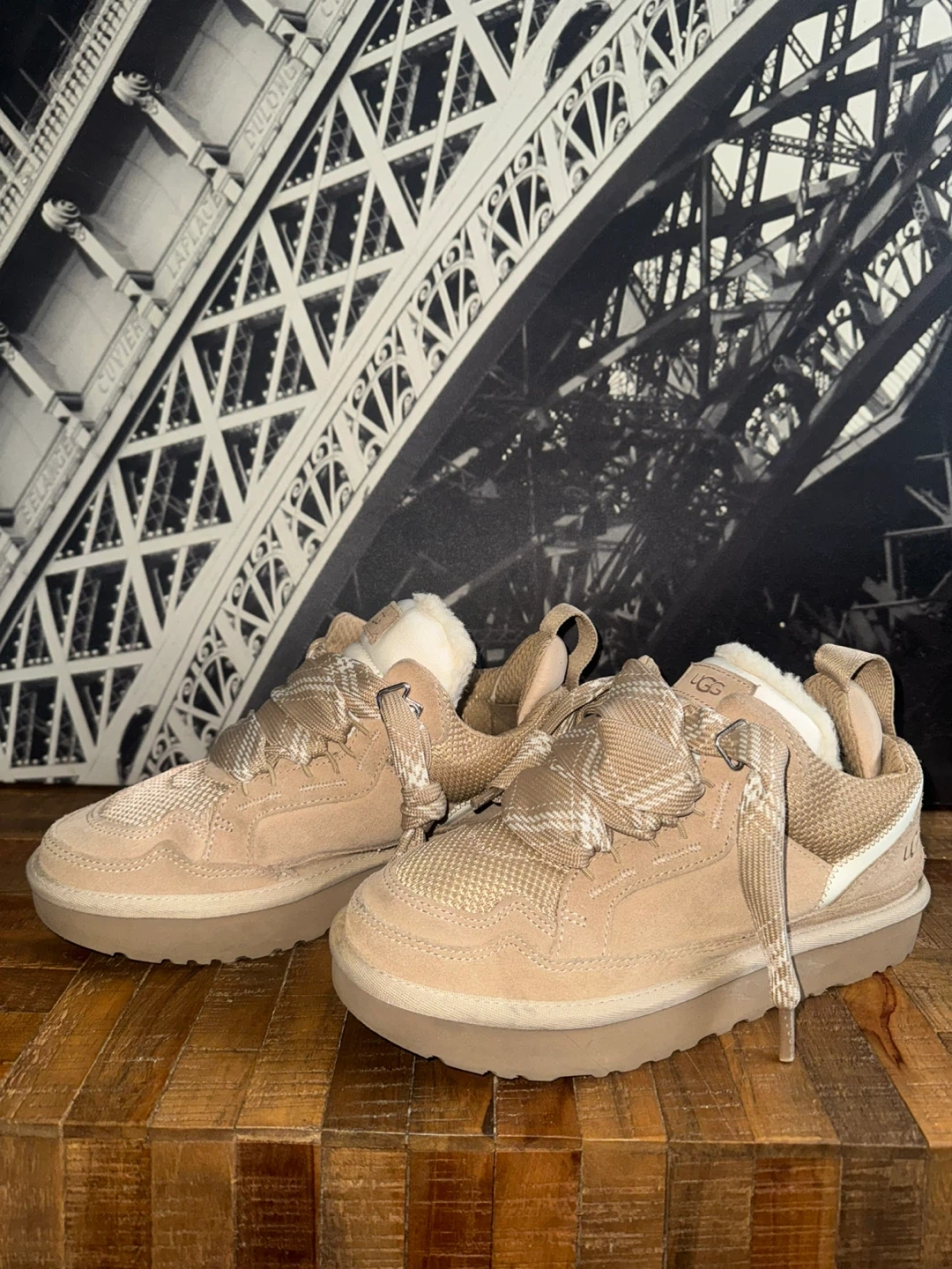 These UGG sneakers are a stylish beige colour. They feature a comfortable suede and mesh upper with fluffy lining. Laces have a decorative pattern. A great casual shoe for everyday wear!