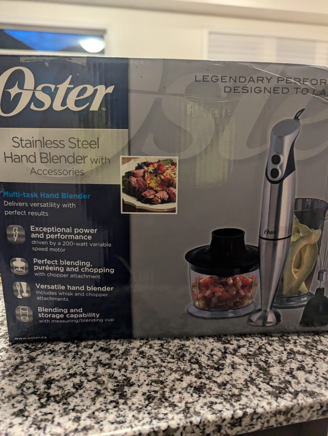 Selling a brand new Oster Stainless Steel Hand Blender with Accessories! This multi-task hand blender delivers versatility with perfect results. It has exceptional power and performance, driven by a 200-watt variable speed motor. Perfect for blending, puréeing, and chopping, it also includes a versatile whisk and chopper attachment, plus blending and storage capability with a measuring/blending cup