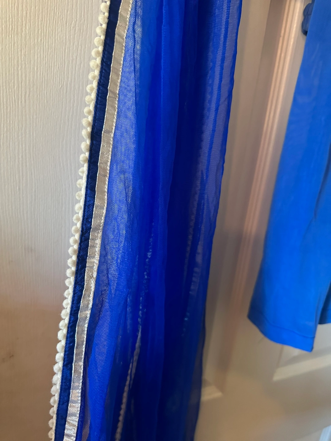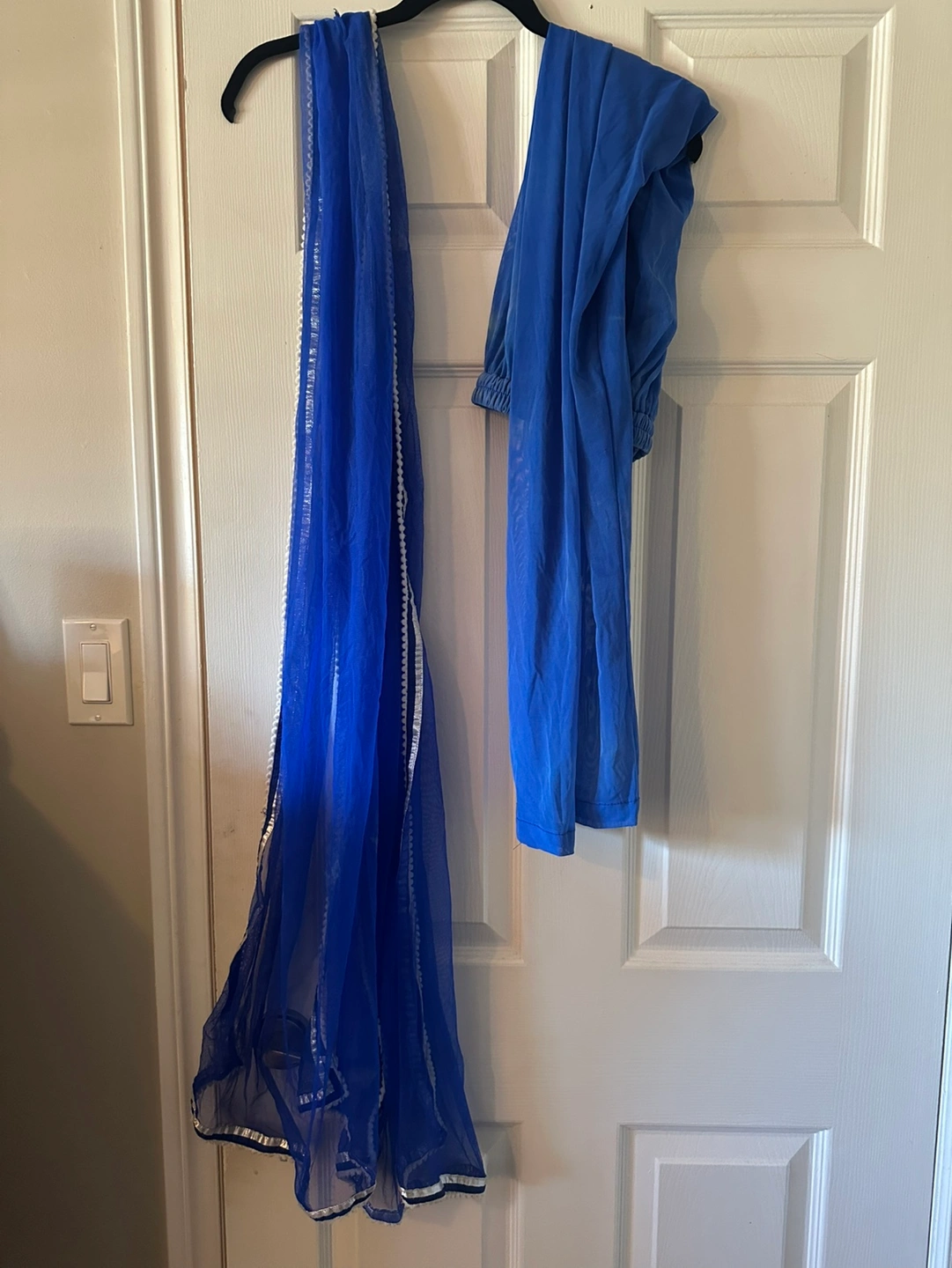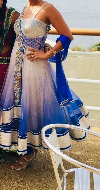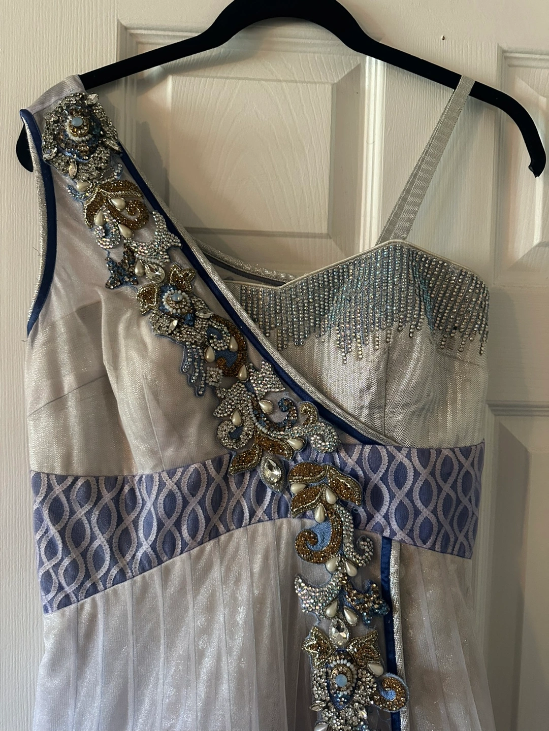 Beautiful Anarkali dress in shades of blue and silver. The dress features intricate detailing and embellishments. Perfect for a special occasion!