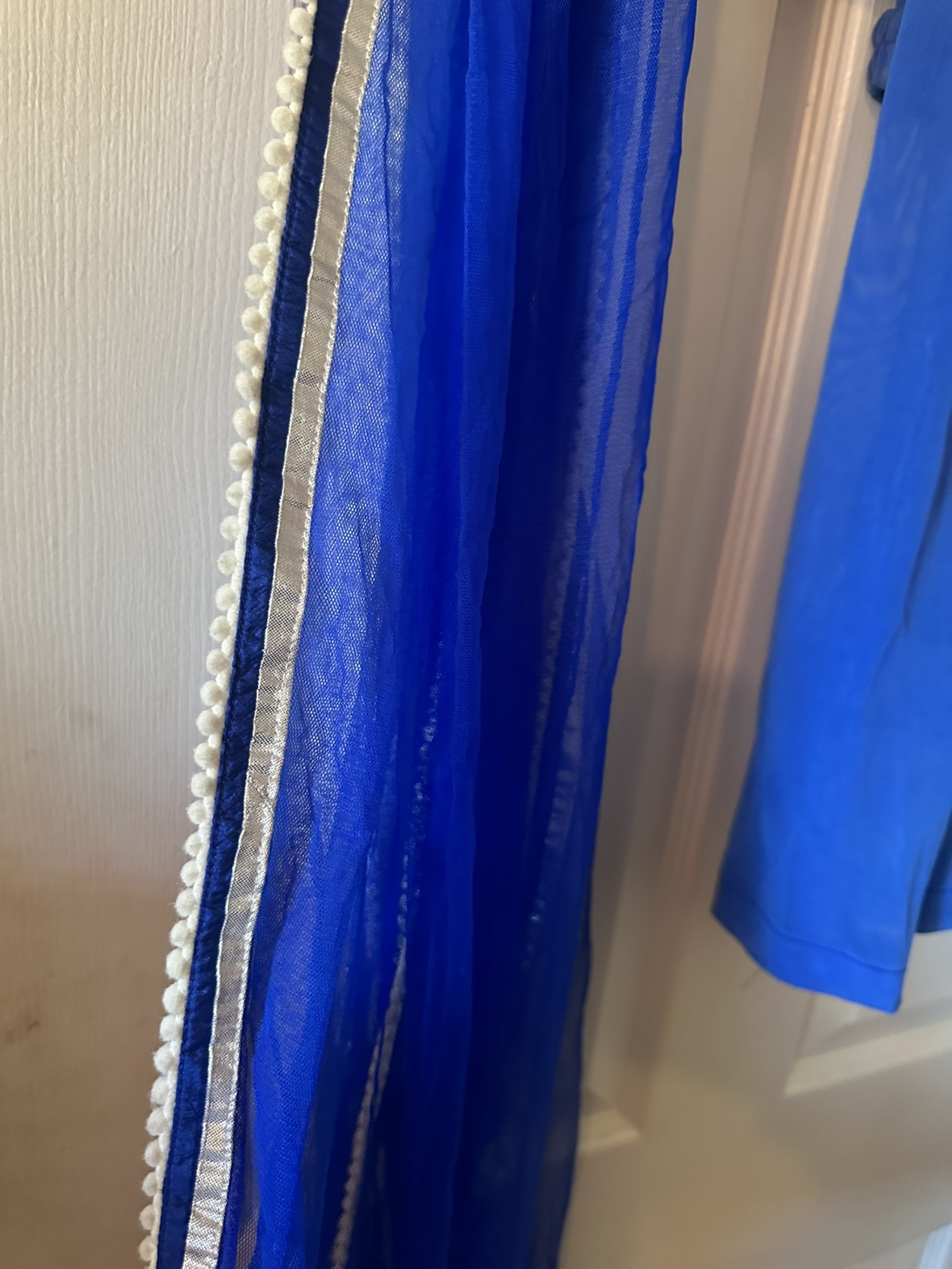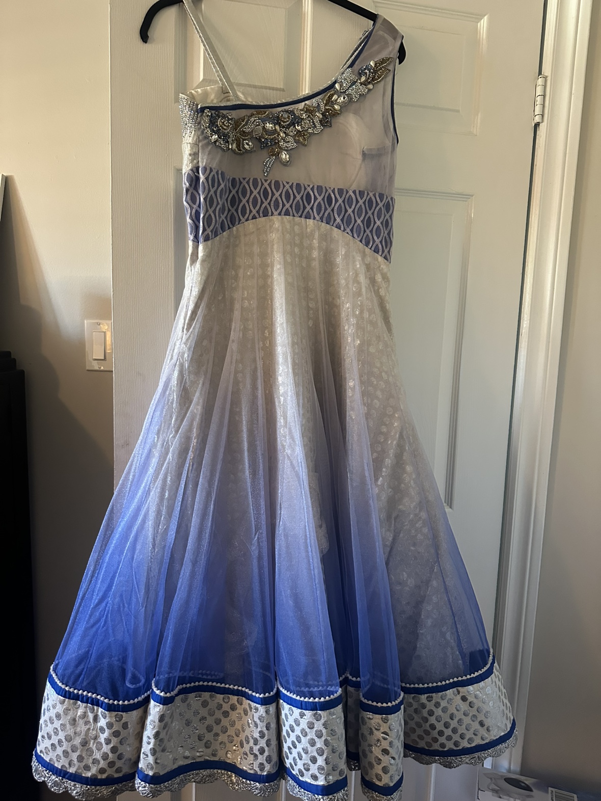Beautiful Anarkali dress in shades of blue and silver. The dress features intricate detailing and embellishments. Perfect for a special occasion!