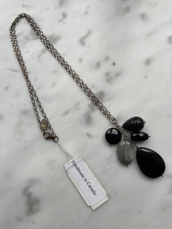 This is a new, never worn sterling silver necklace with natural black stones by F2G, made in Canada. The chain measures about 44 cm. The sterling silver chain shows some light tarnishing but can be polished. The necklace was a gift and has never been worn (still has the original tag). Asking $35. Pickup at Davisville station.