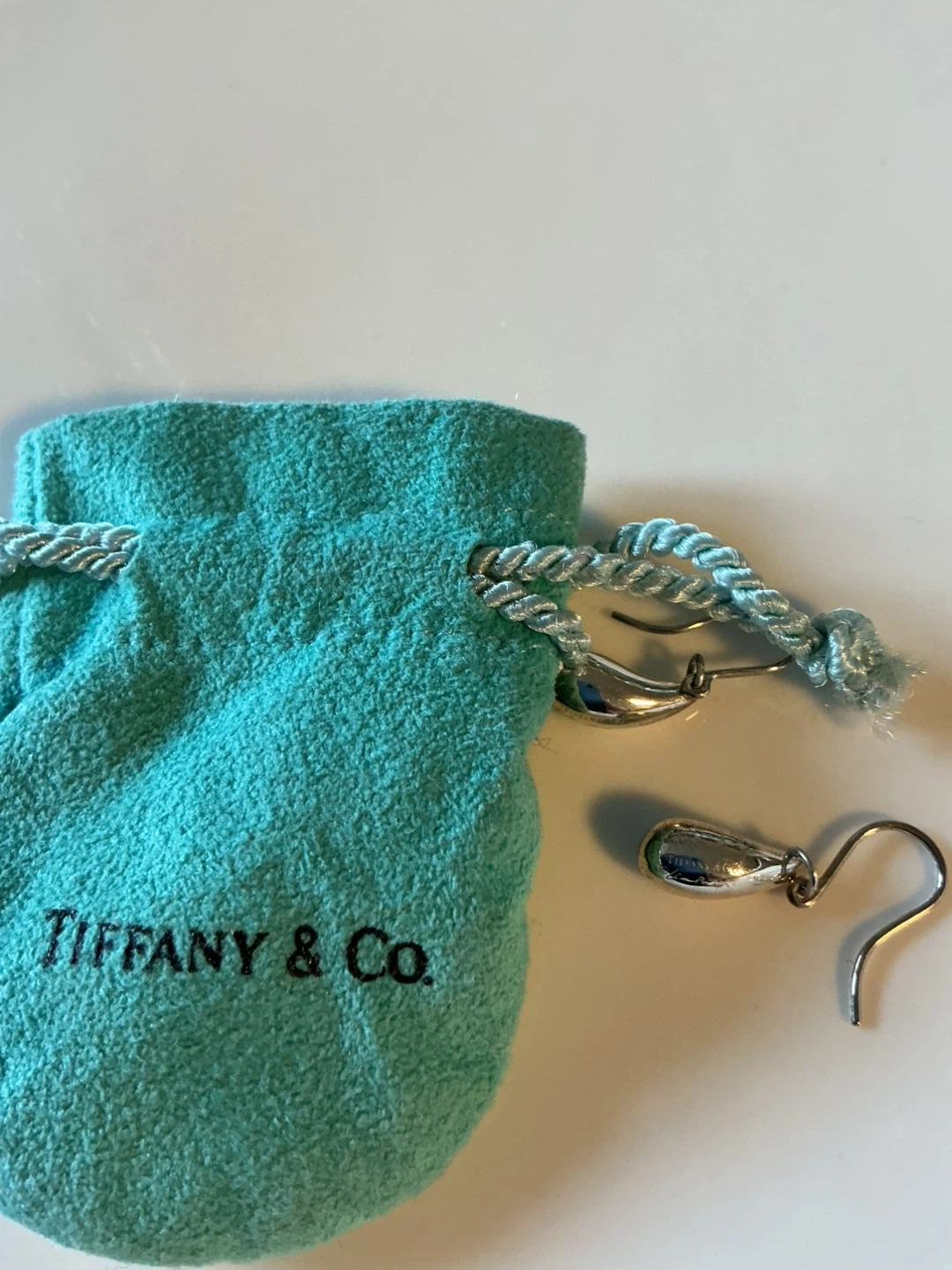 These are Tiffany & Co. sterling silver teardrop earrings. They come with their signature blue drawstring pouch. They're elegant and versatile for any occasion!