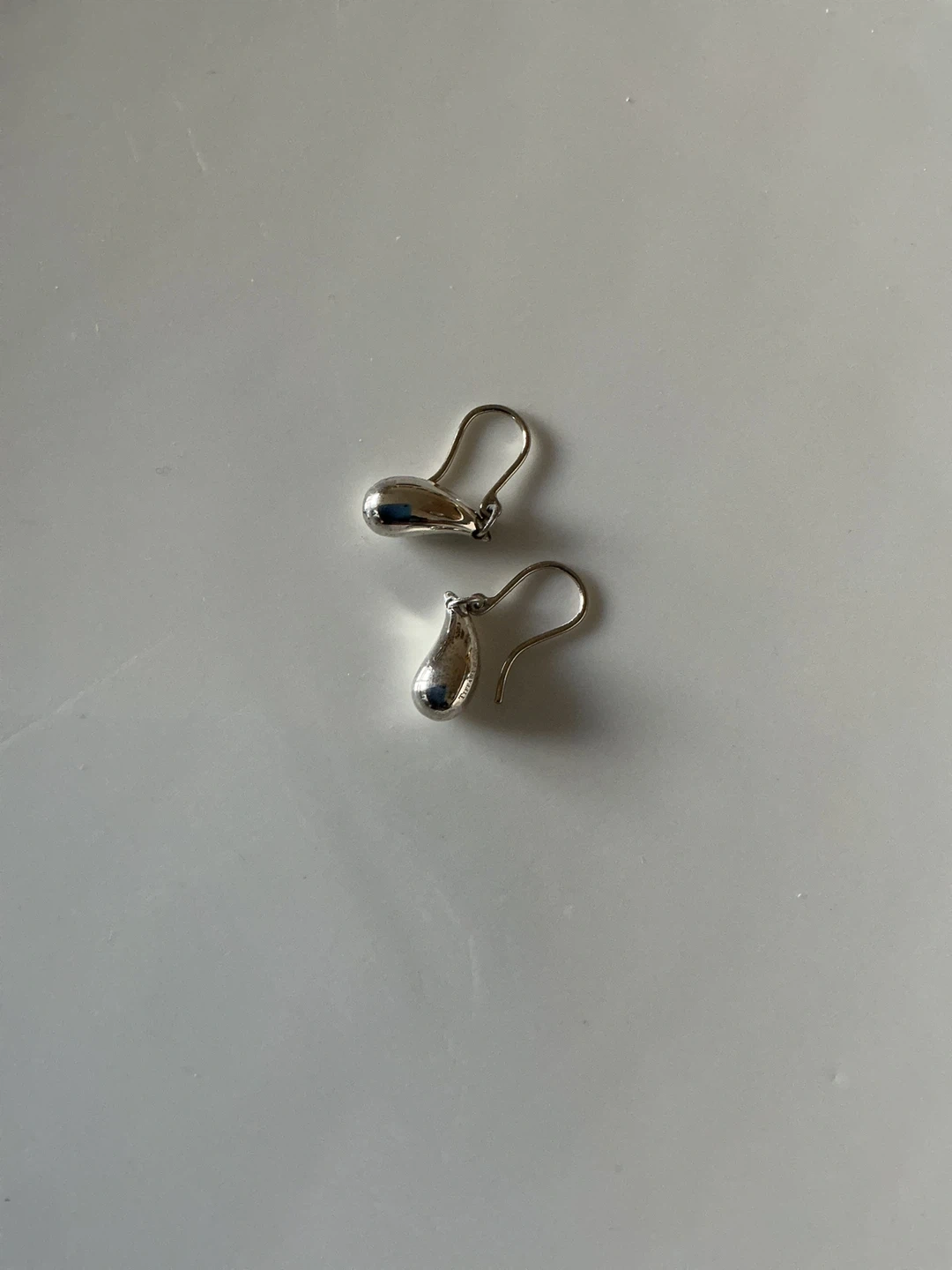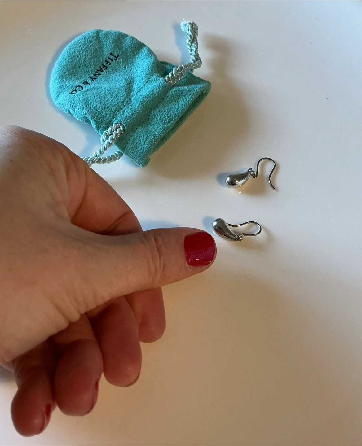 These are Tiffany & Co. sterling silver teardrop earrings. They come with their signature blue drawstring pouch. They're elegant and versatile for any occasion!