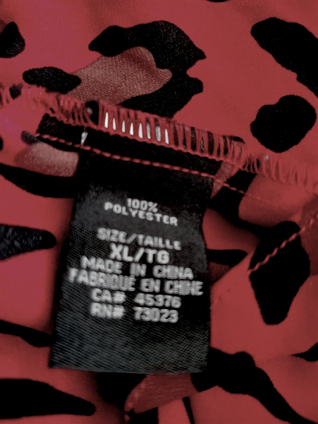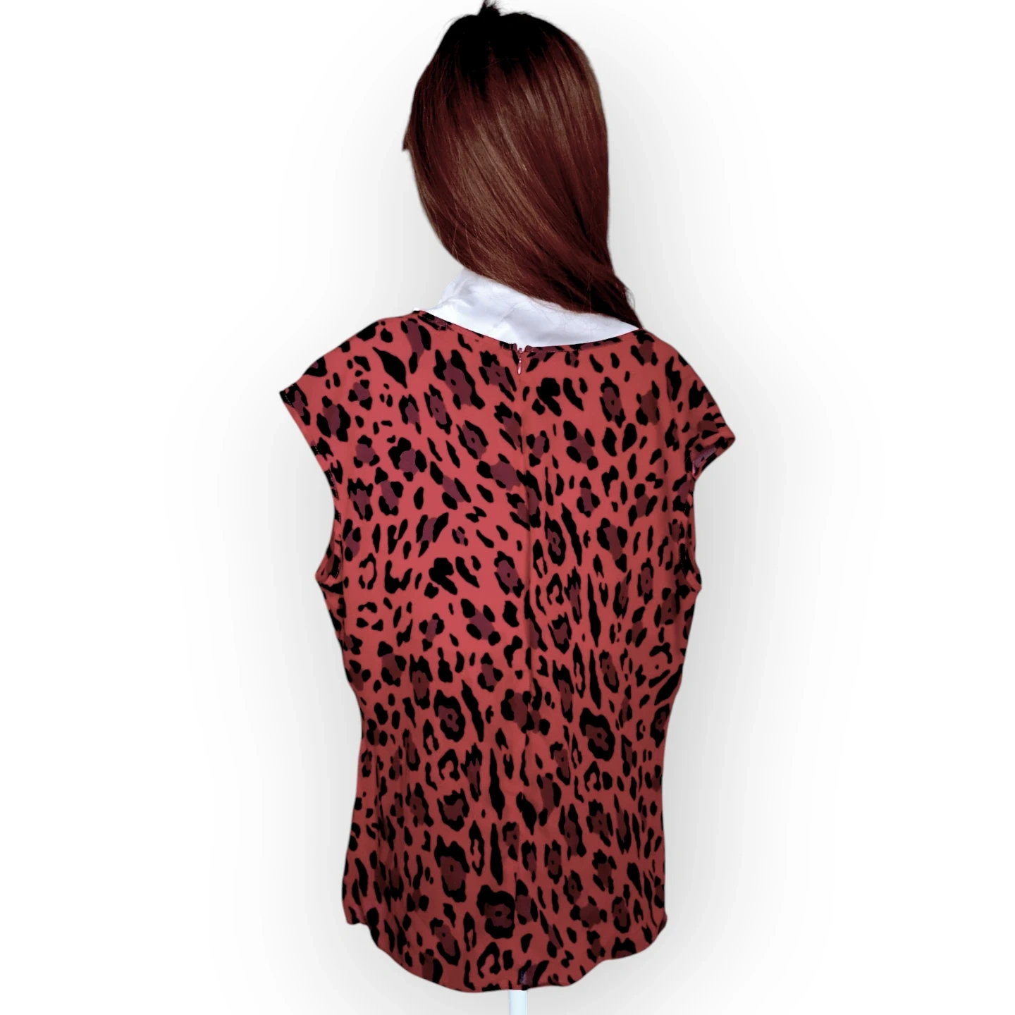 This is a stylish red sleeveless blouse with a black leopard print. It features a flattering twist-front design and a zipper closure at the back. The material is lightweight and flowy. It's perfect for dressing up or down!