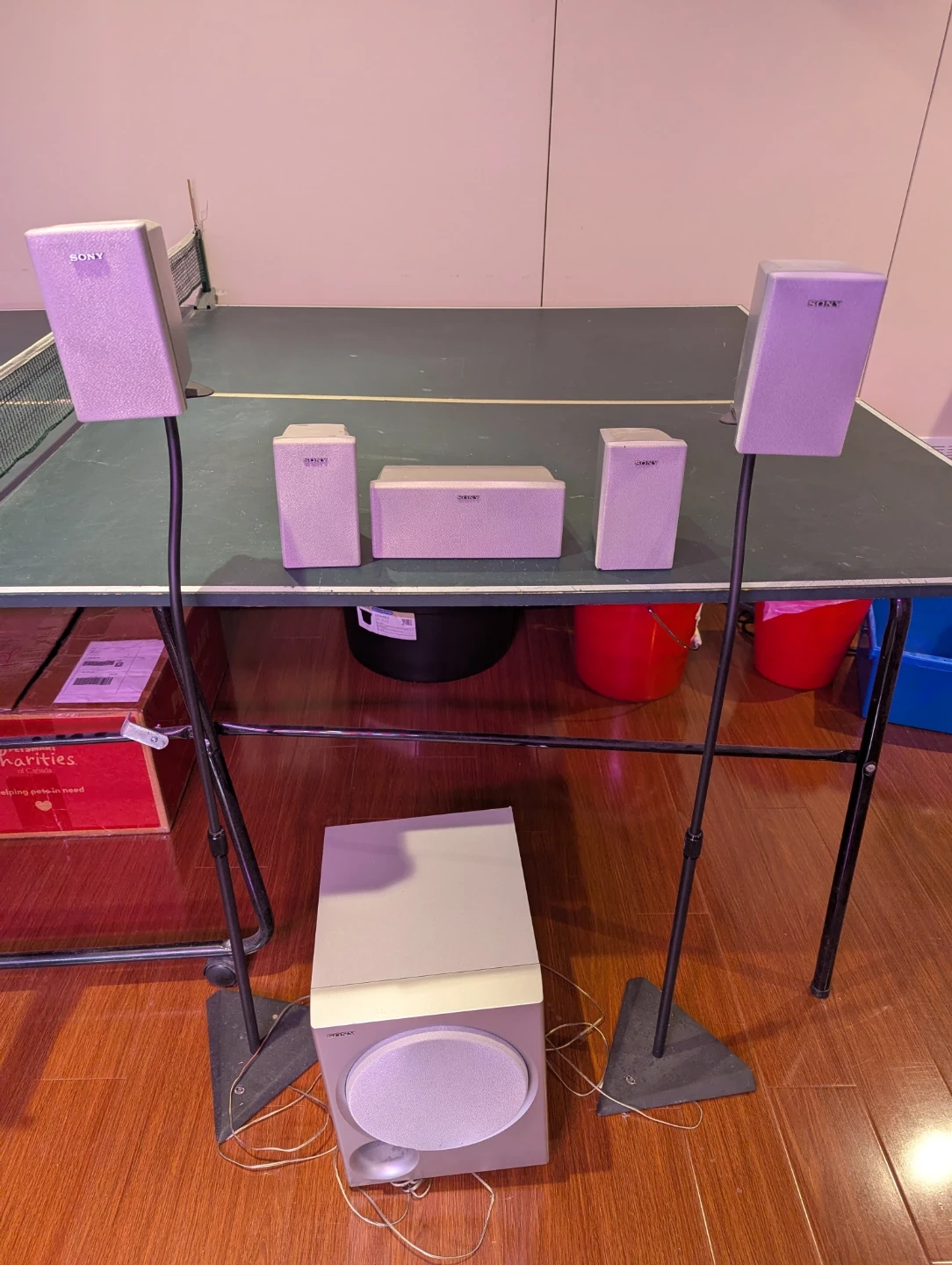 Sony speaker system with subwoofer and satellite speakers. Includes stands for satellite speakers. Great for a home theatre setup!
