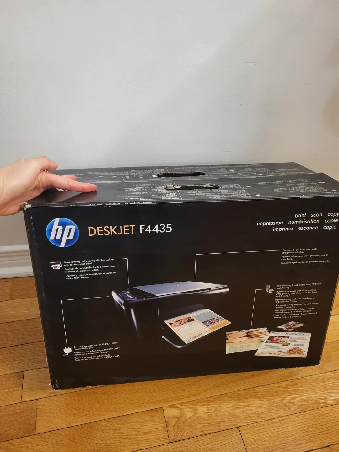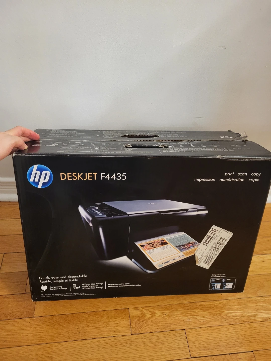 This HP Deskjet F4435 offers print, scan, and copy functions. It supports plain 8.5 x 11 inch paper and photo sizes. Comes with the original box.