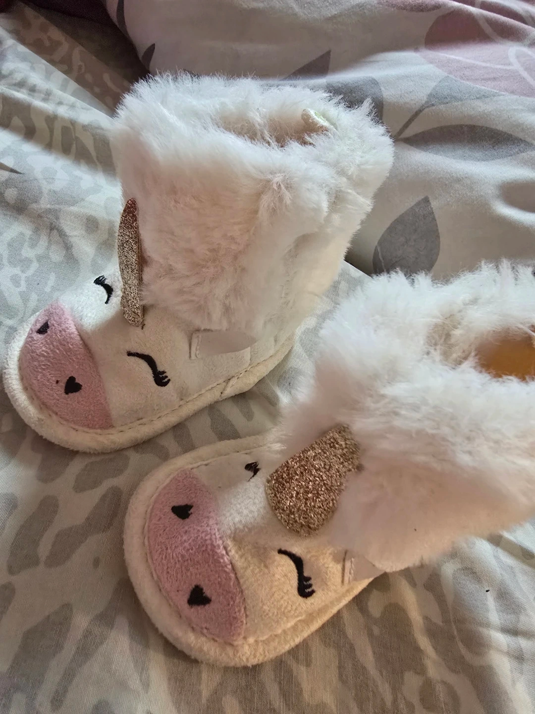 These adorable infant unicorn booties are in great condition and ready for a new little owner! They're a size 0-3 and feature a cute unicorn design with a fluffy white upper and pink accents