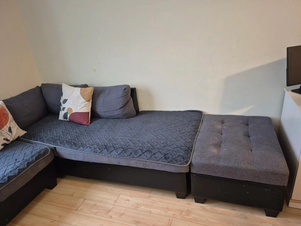 Selling our modern grey and black 6-seater sectional with matching ottoman. This was originally $700, but we are priced low for a quick sale due to space constraints, perfect for a family room or basement.