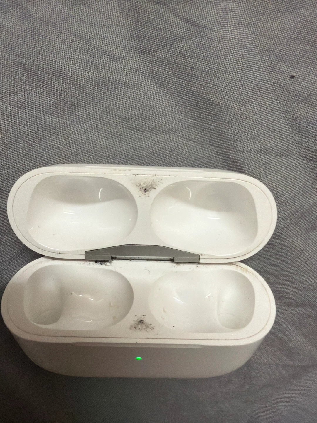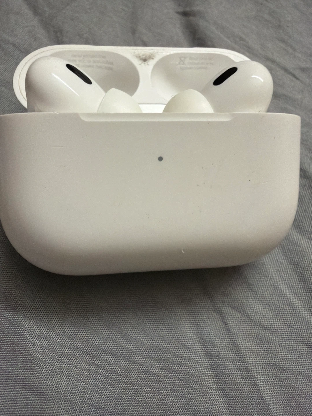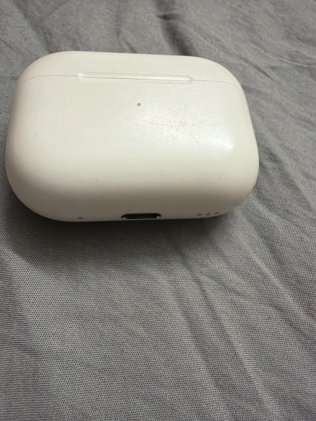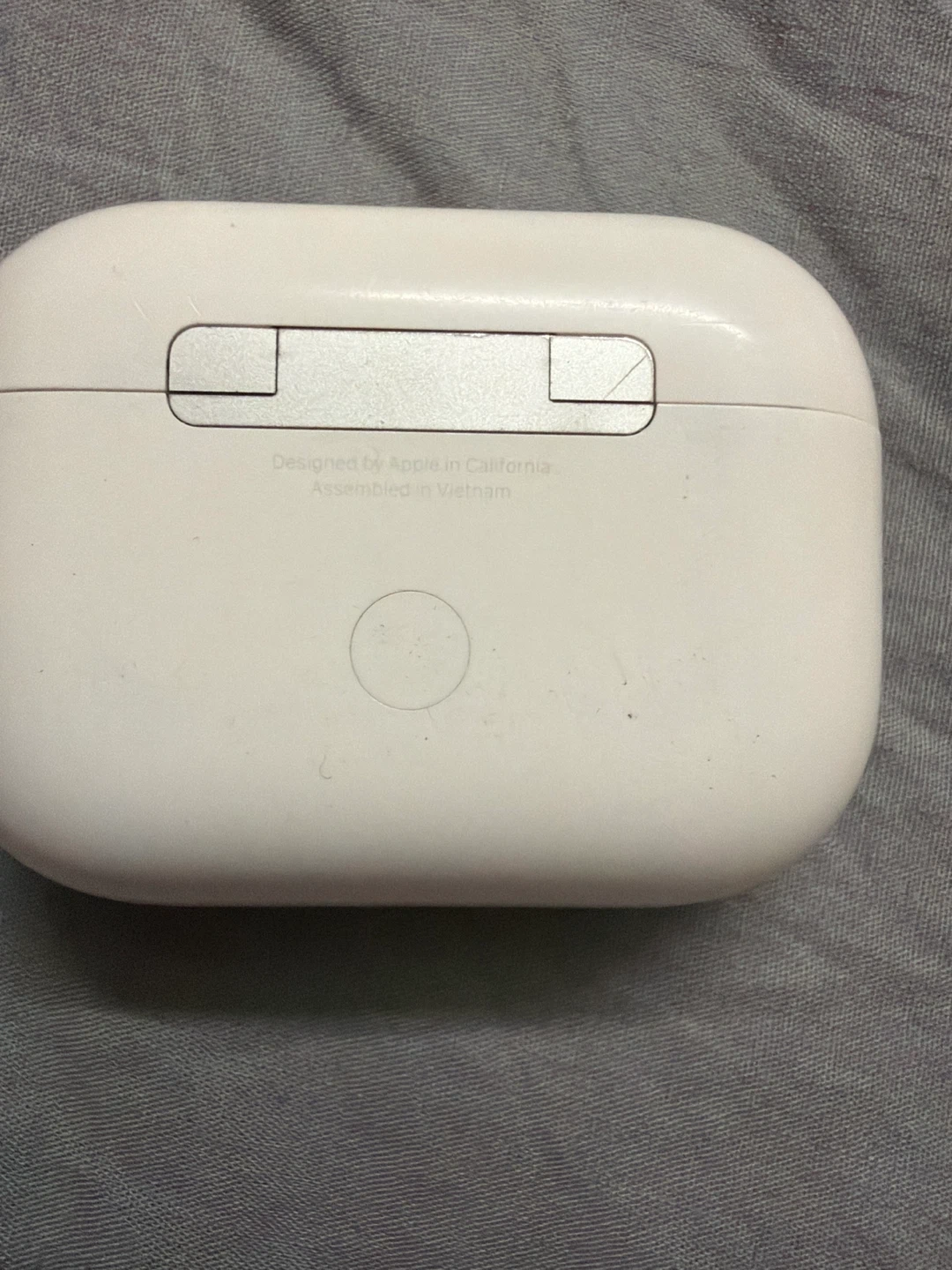 This is a white Apple AirPods Pro charging case. It's designed in California and assembled in Vietnam. The case comes with the charging port at the bottom.