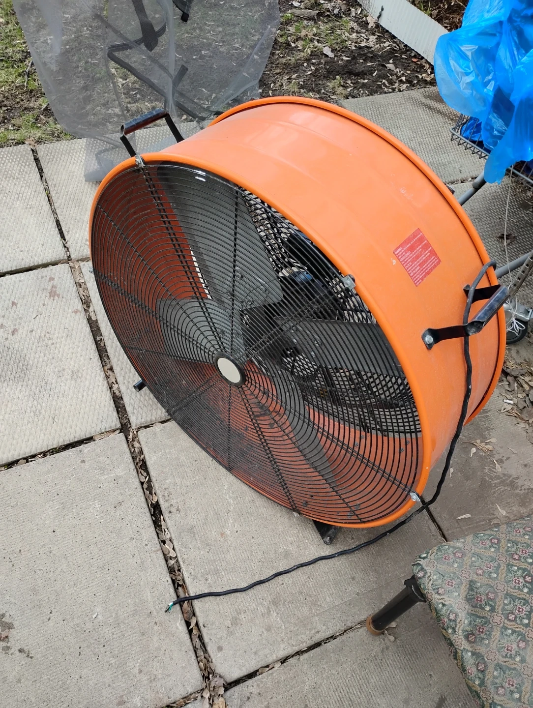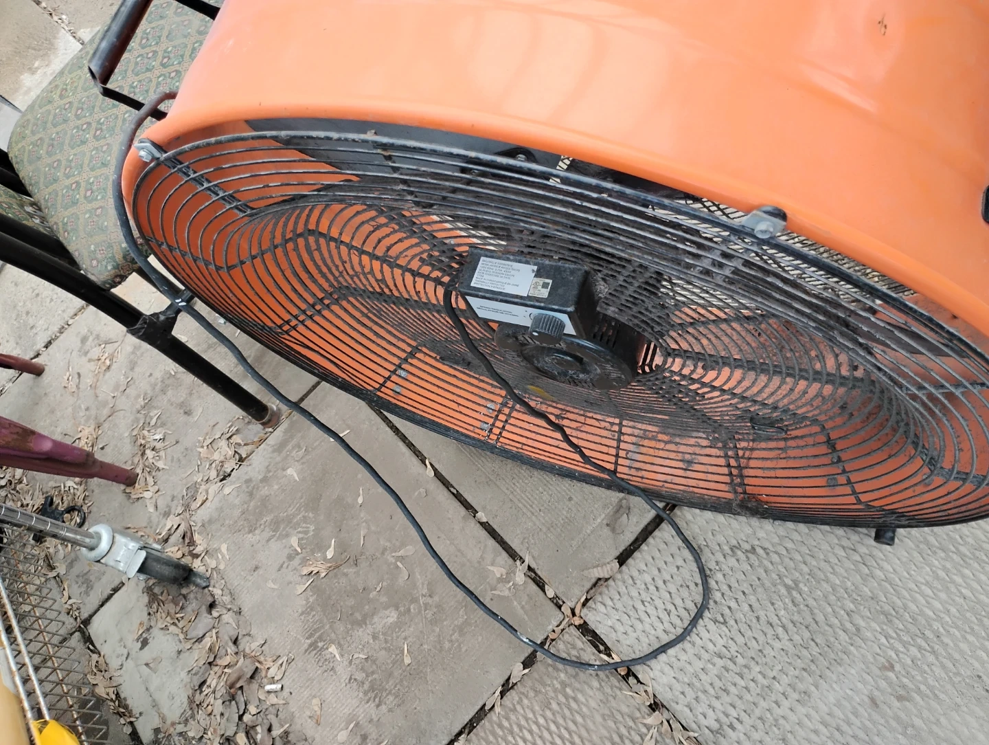 This is a large, orange industrial drum fan. It has a metal grille and a speed regulator. It's great for moving a lot of air in workshops or garages.