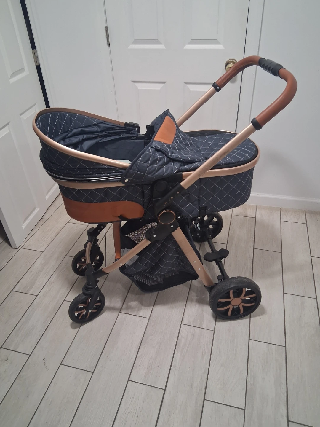 Navy blue baby stroller with a bassinet attachment. It features a diamond-stitched pattern on the fabric and faux leather accents on the handle. The frame has a rose gold finish. This stroller's bassinet is removable and converts to a seat. It's ideal for infants and toddlers.