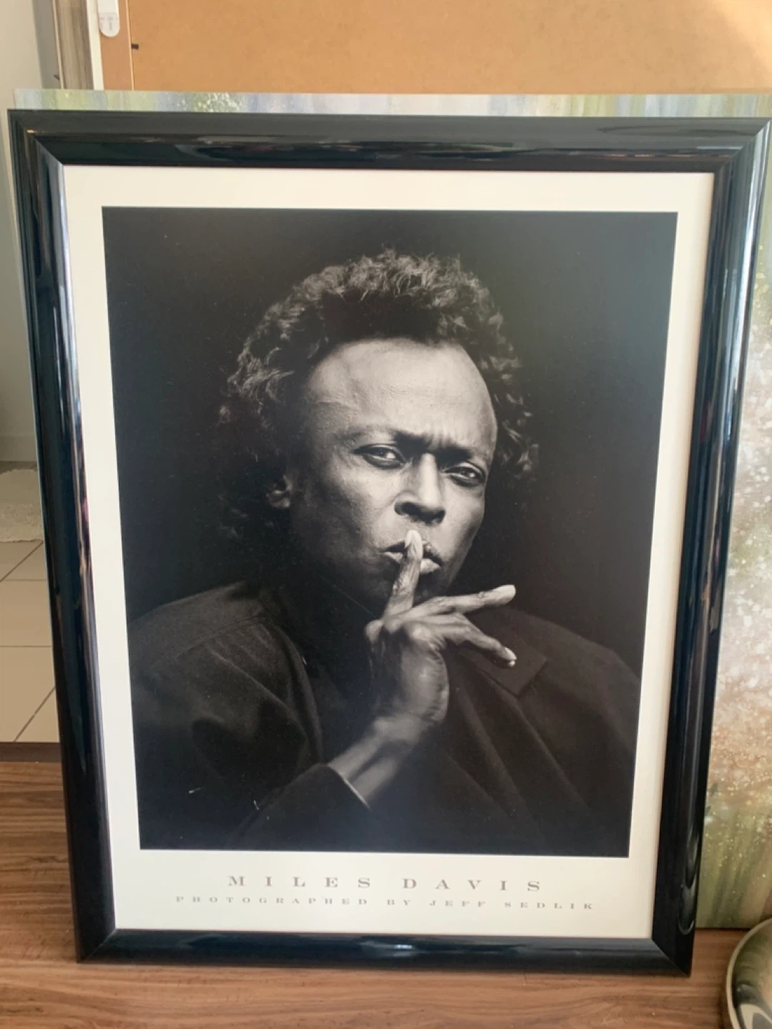 Two framed black and white portrait prints, one of Miles Davis and another of BB King. Both are photographed by Jeff Sedlik. Black frames. Add some classic music art to your space! 26 3/4 x 34 3/4.