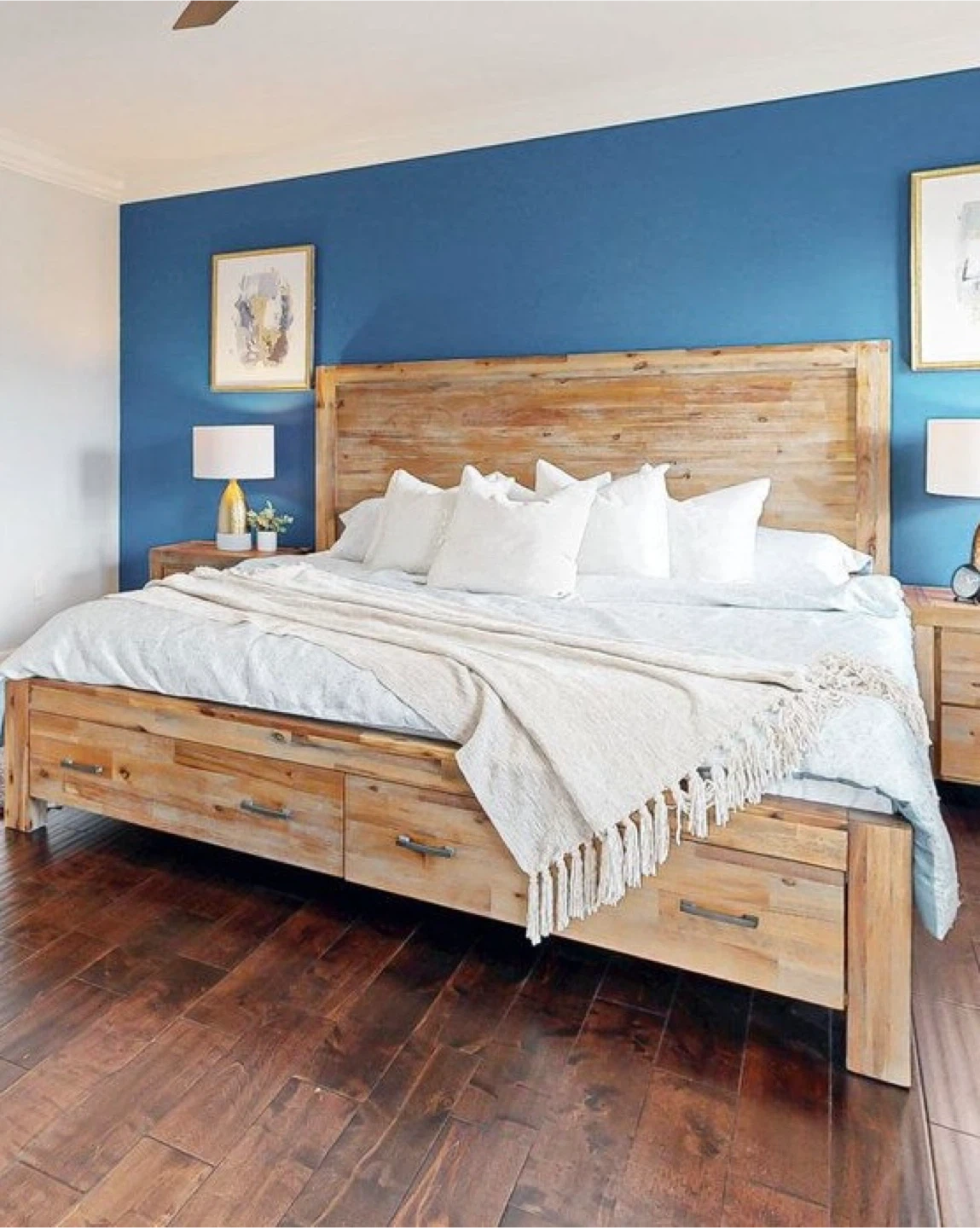 Solid wood bed frame with a rustic finish. Features four built-in storage drawers. Sturdy construction and a timeless design.