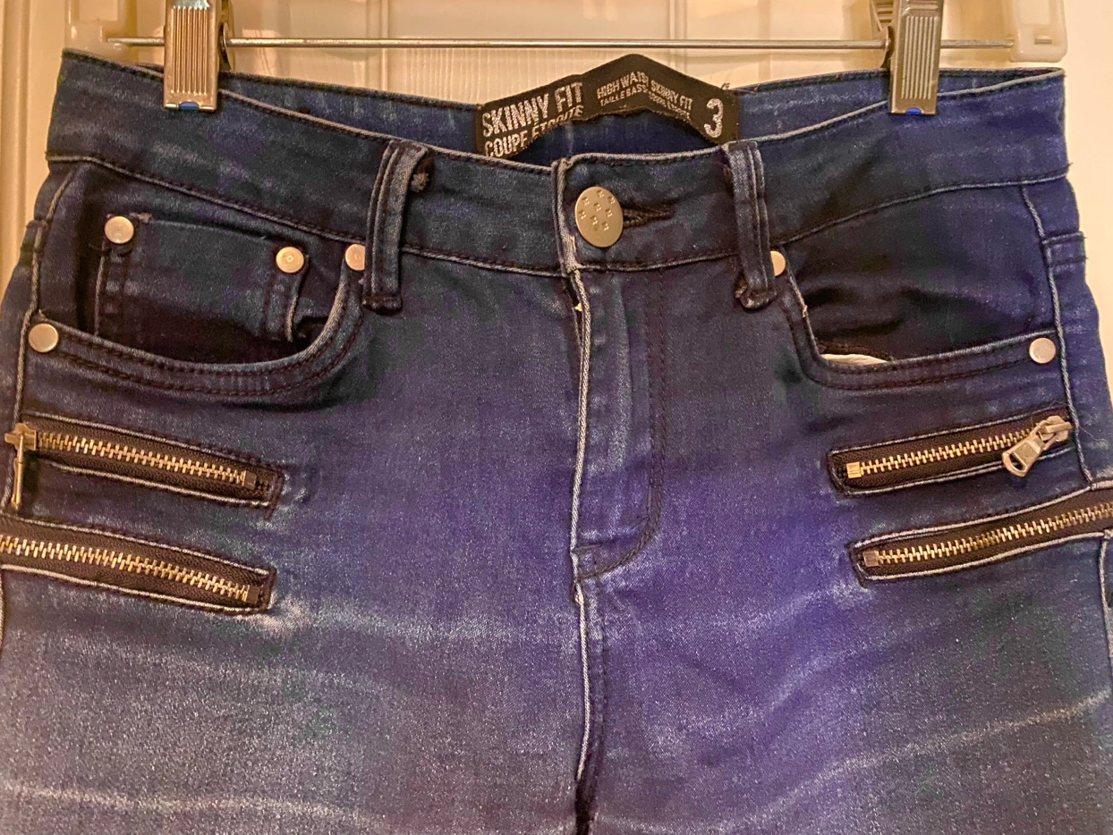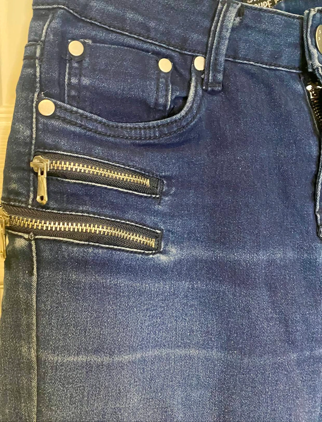 Skinny Fit Rich Blue Denim Size 3 w Dual Zippers under pockets and knee details, high waist, stretch fit.