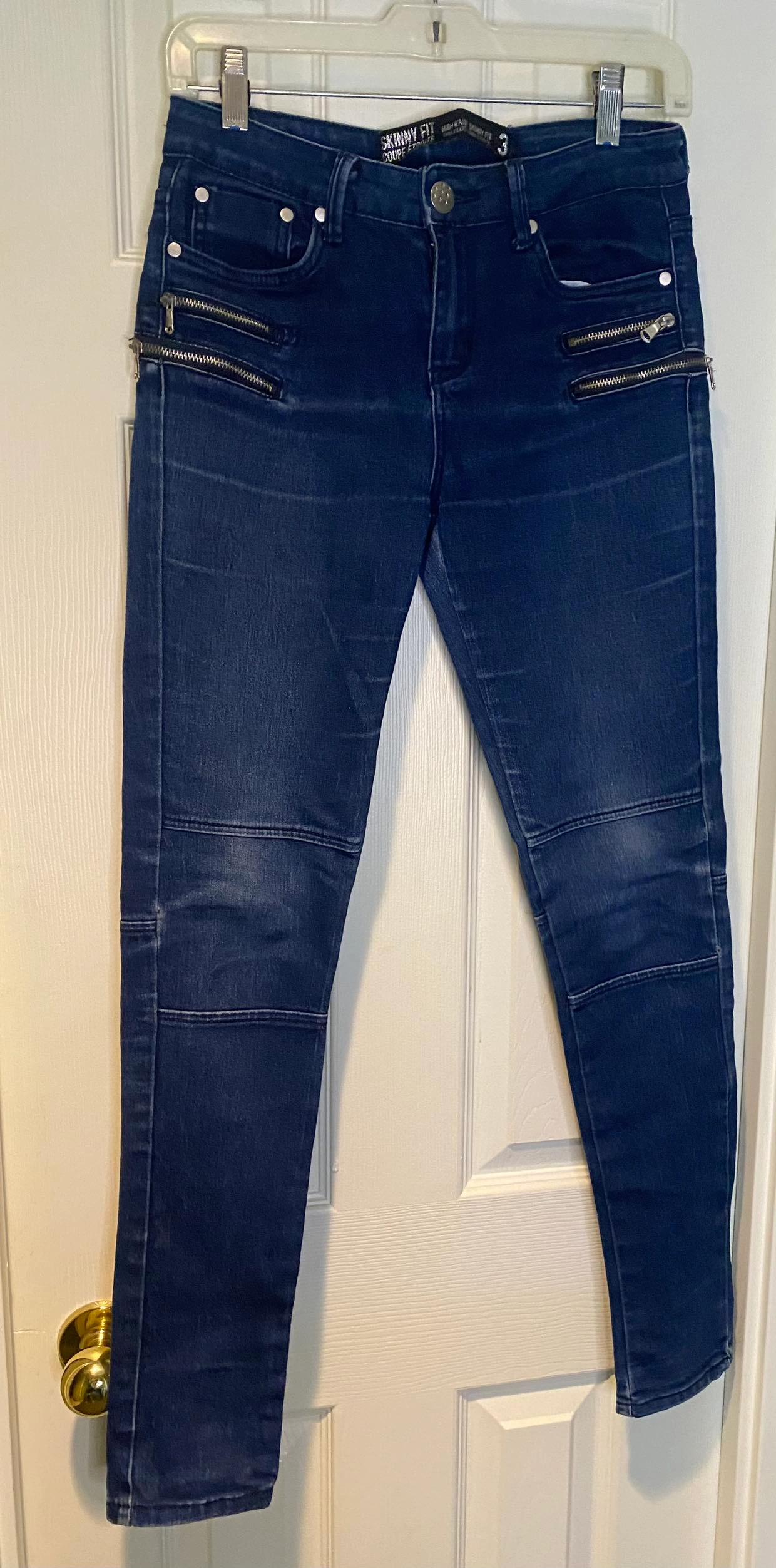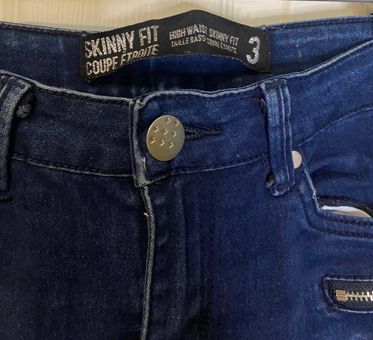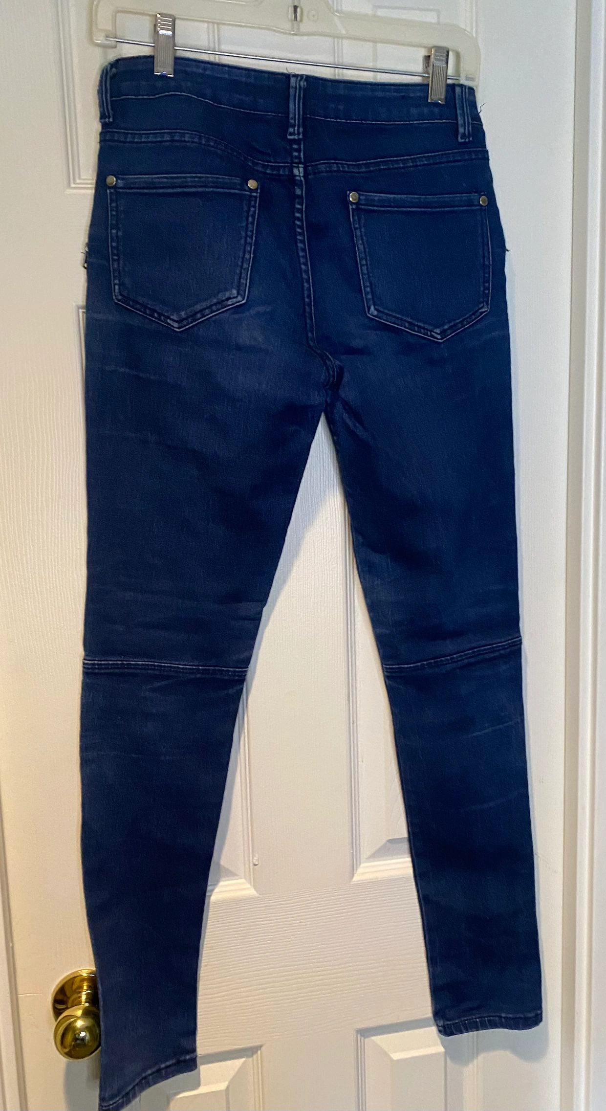 Skinny Fit Rich Blue Denim Size 3 w Dual Zippers under pockets and knee details, high waist, stretch fit.