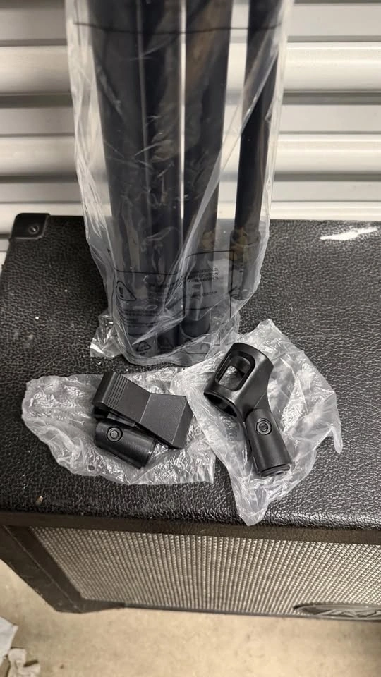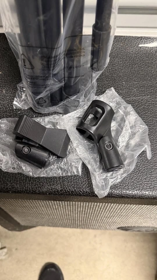 New microphone boom stand (model: 28MIS002-BM-2M-06) with adjustable height and boom arm. Includes microphone holder clips as shown in photos. Comes in original packaging (opened for photos).