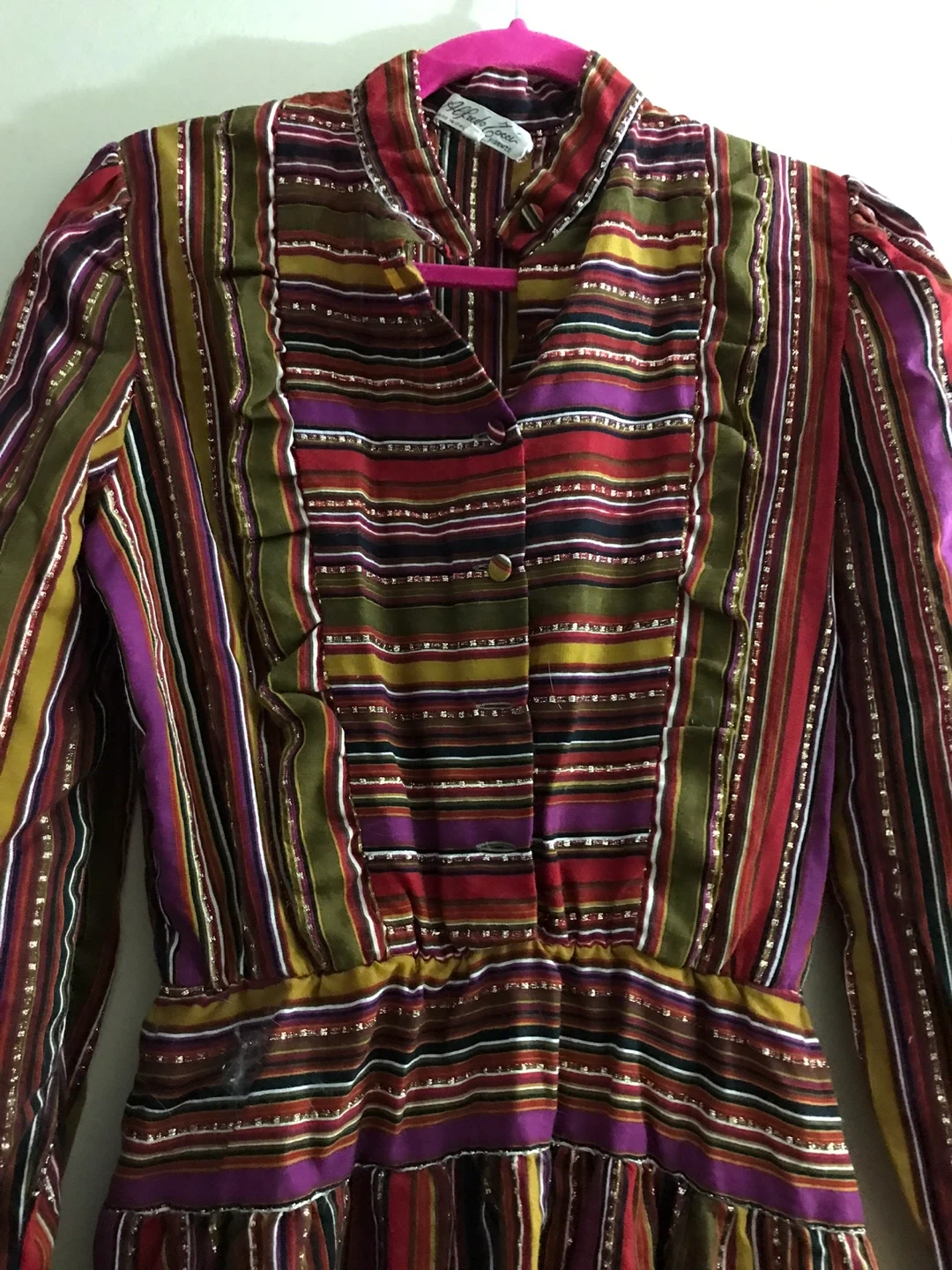 This is a beautiful vintage Alfredo Zocci women’s dress, size 46. This dress features a unique striped pattern with long sleeves. The dress is in used condition, but it has been well-maintained and has lots of life left in it. It’s a lovely piece for anyone who appreciates vintage fashion.