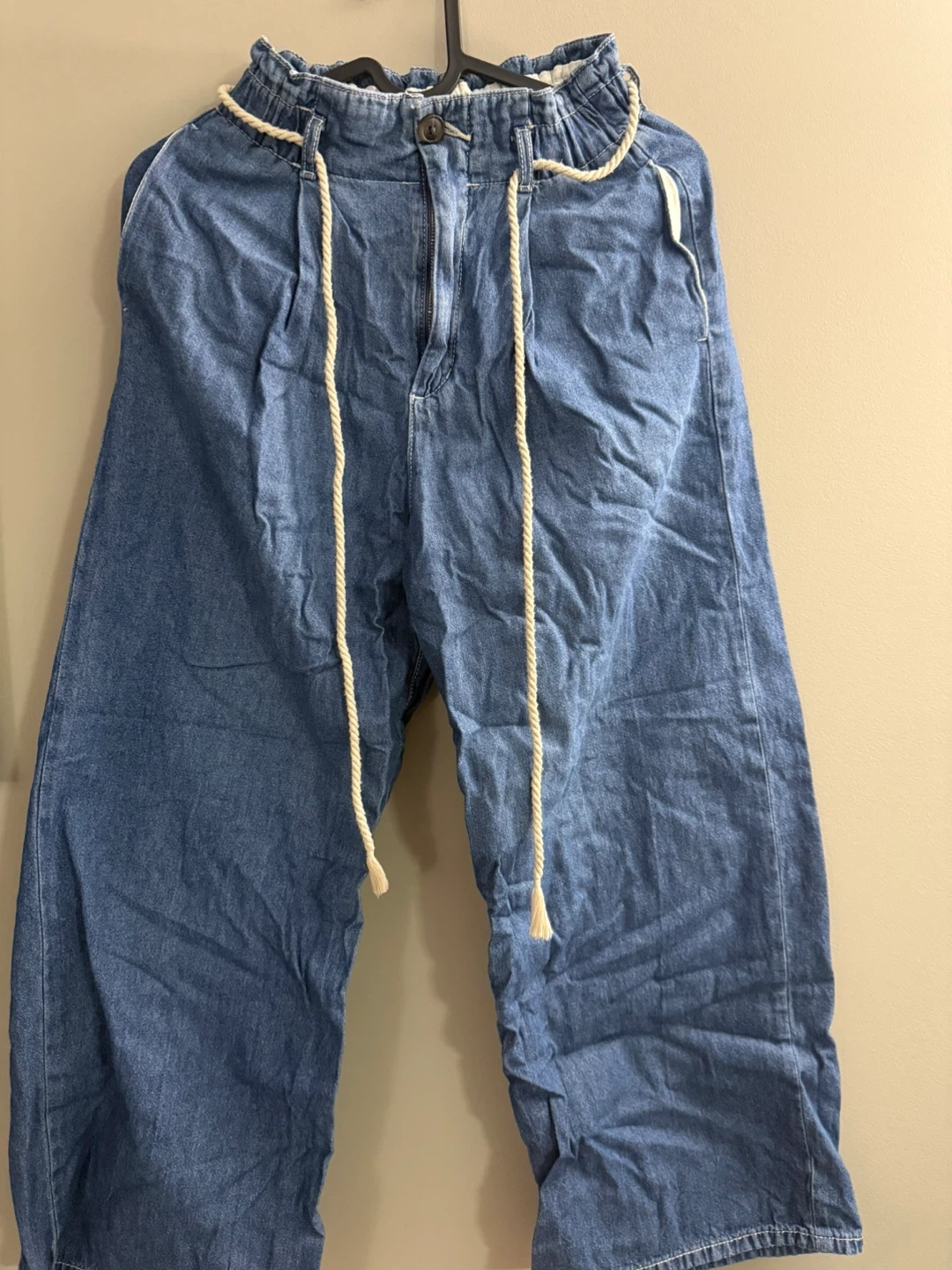 Selling a pair of wide leg denim pants. They're in great condition and feature a comfortable elastic waistband with a drawstring. Perfect for a relaxed, stylish look!