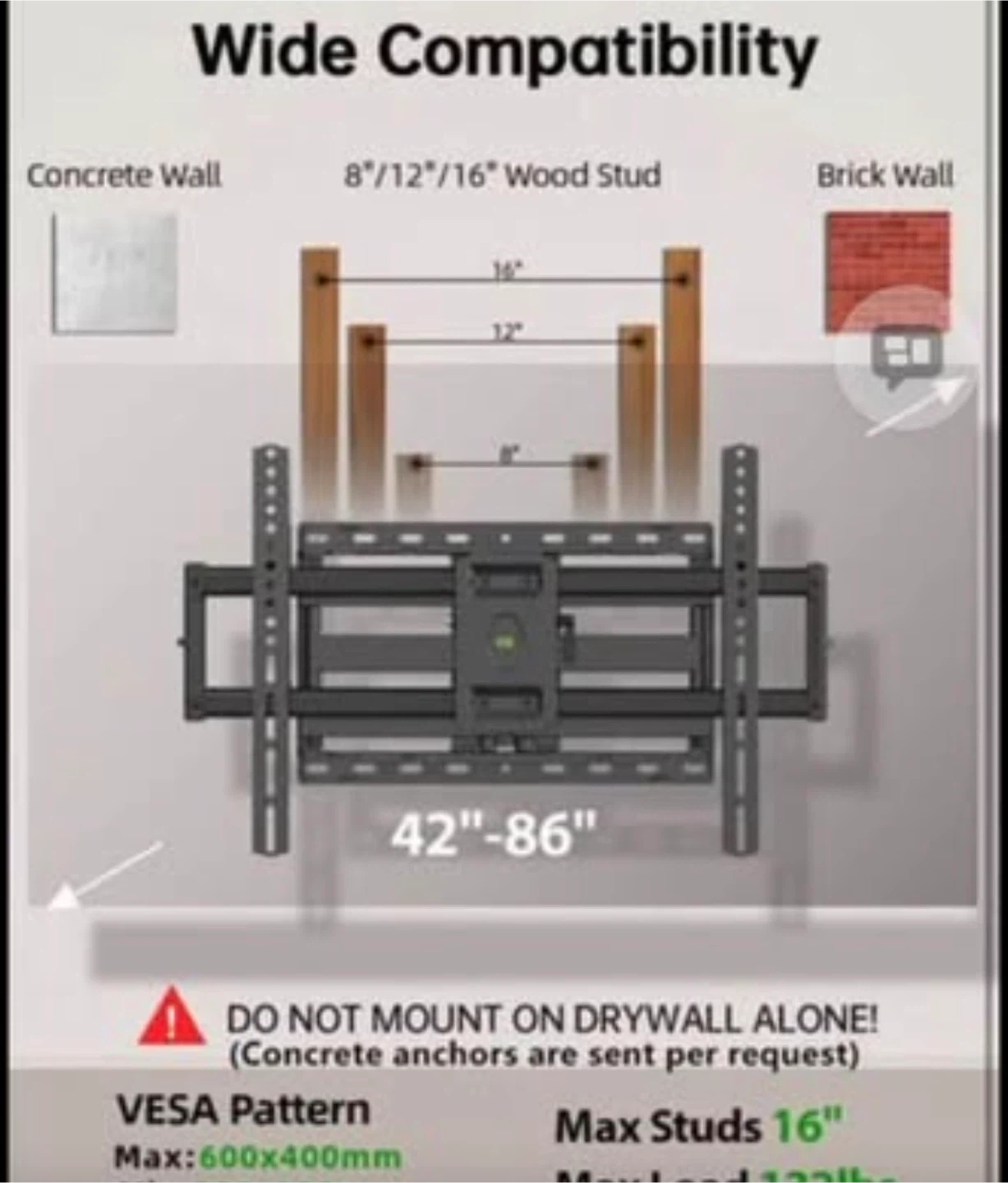 USX MOUNT Full Motion TV Wall Mount for Most 42-86 inch Flat Screen TVs, Wall Mount TV Bracket with Dual Swivel Articulating Arms, TV Mount with Max VESA 600x400mm, up to 132lbs, Fits 8” 12” 16" Studs