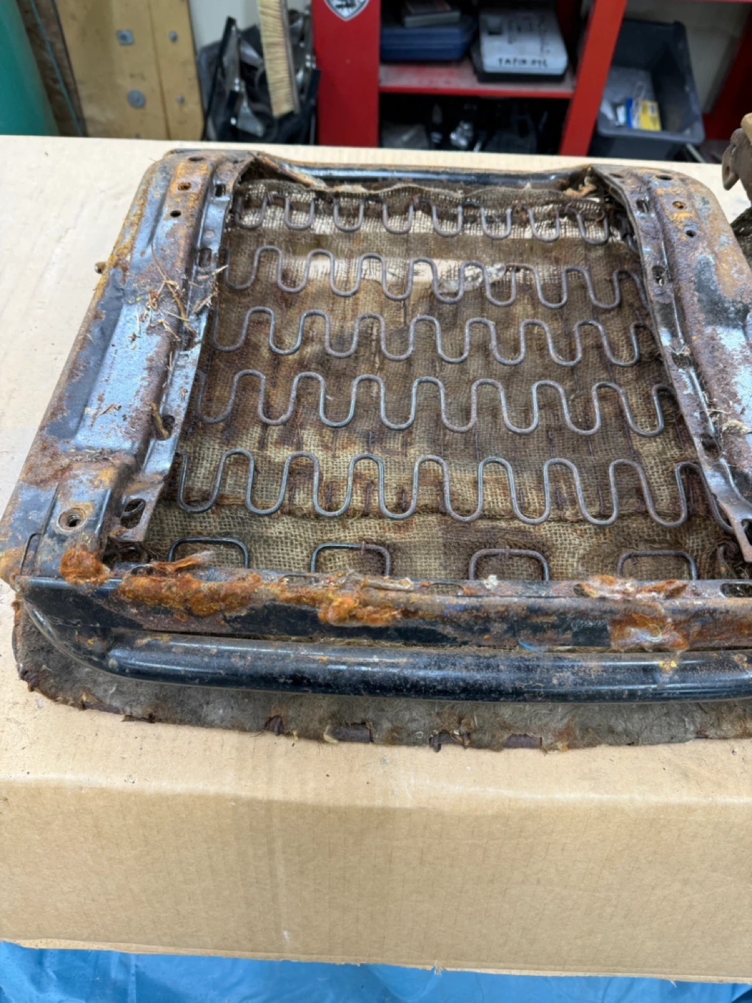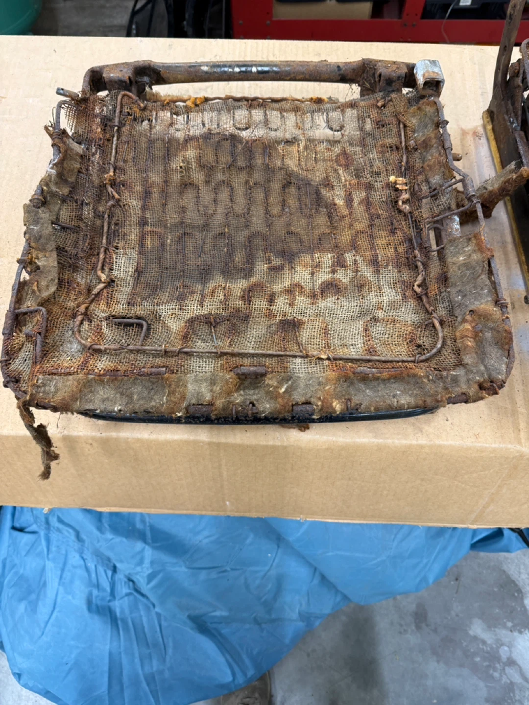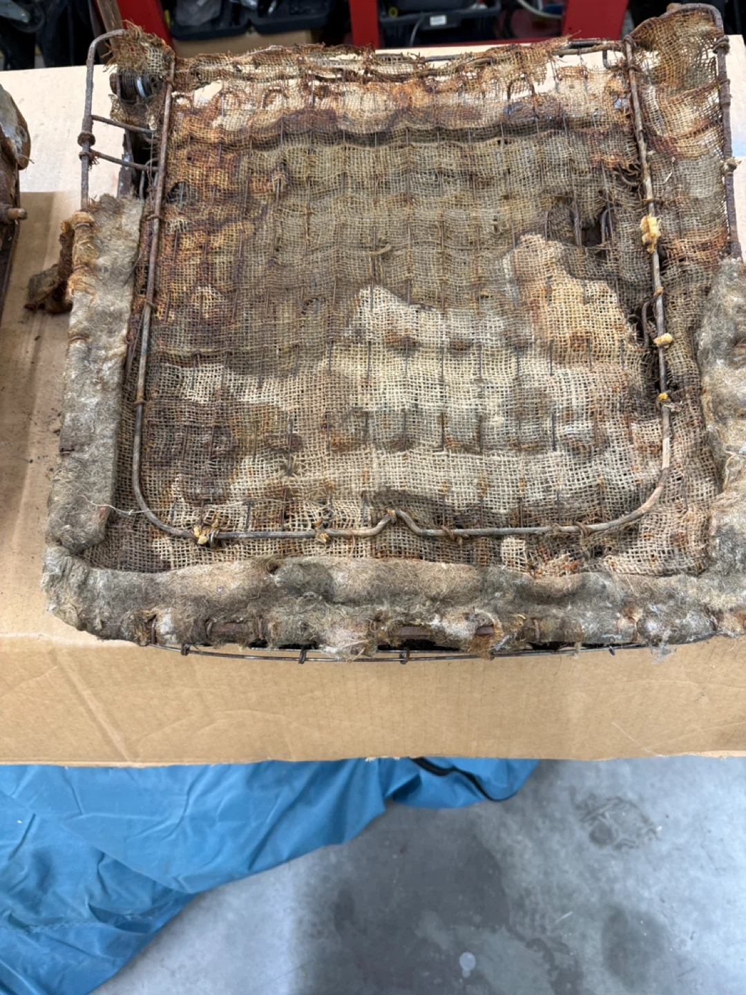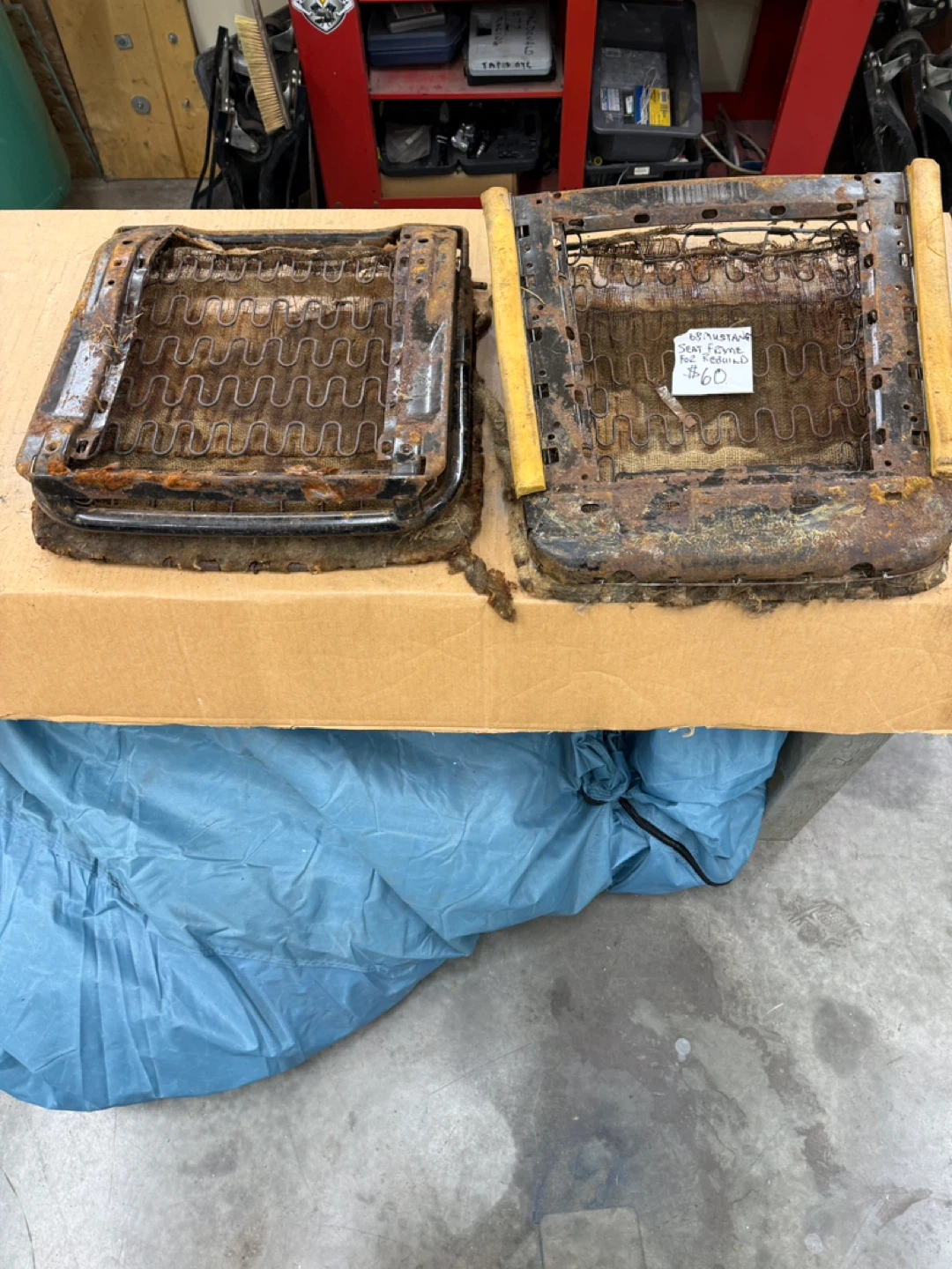 Original 1968 Ford Mustang seat frame. Metal frame with springs and burlap seat base. Shows significant rust and wear, sold as-is for rebuild. 54th ave 248th st Aldergrove BC