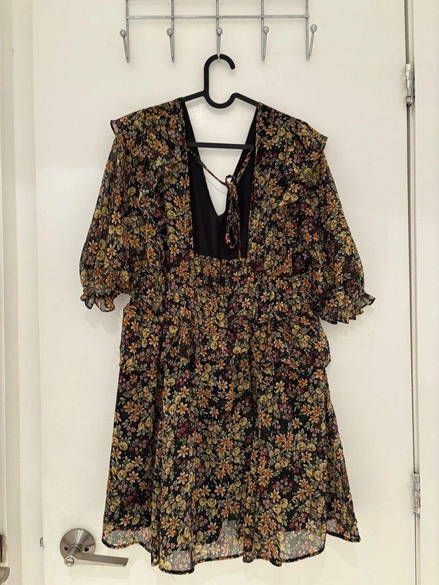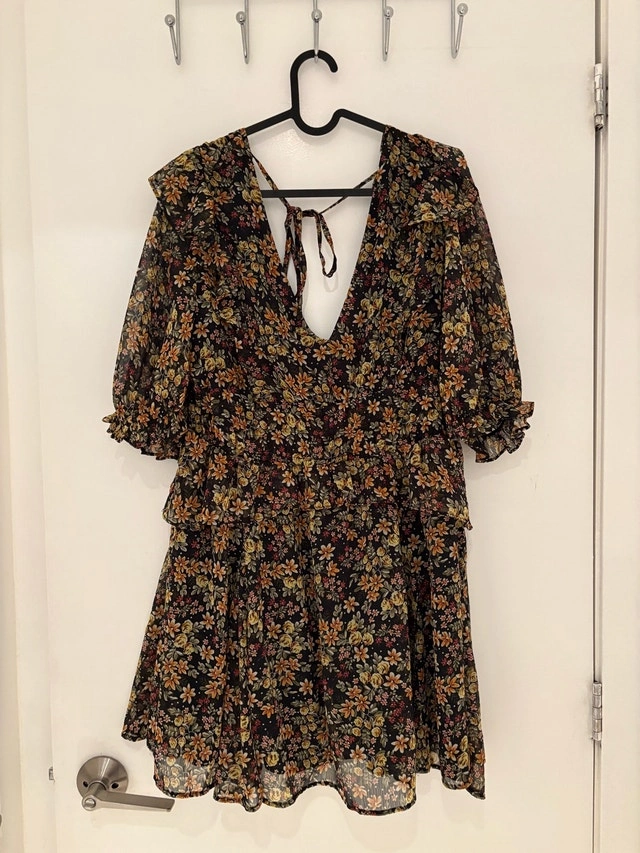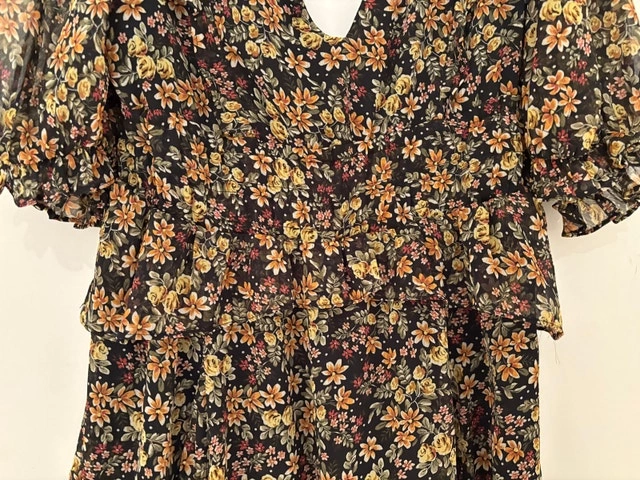 Chic mini dress with vibrant floral pattern. Features a deep V-neck and puff sleeves. Perfect for day or night. Pick up at King and Portland. Cash only.