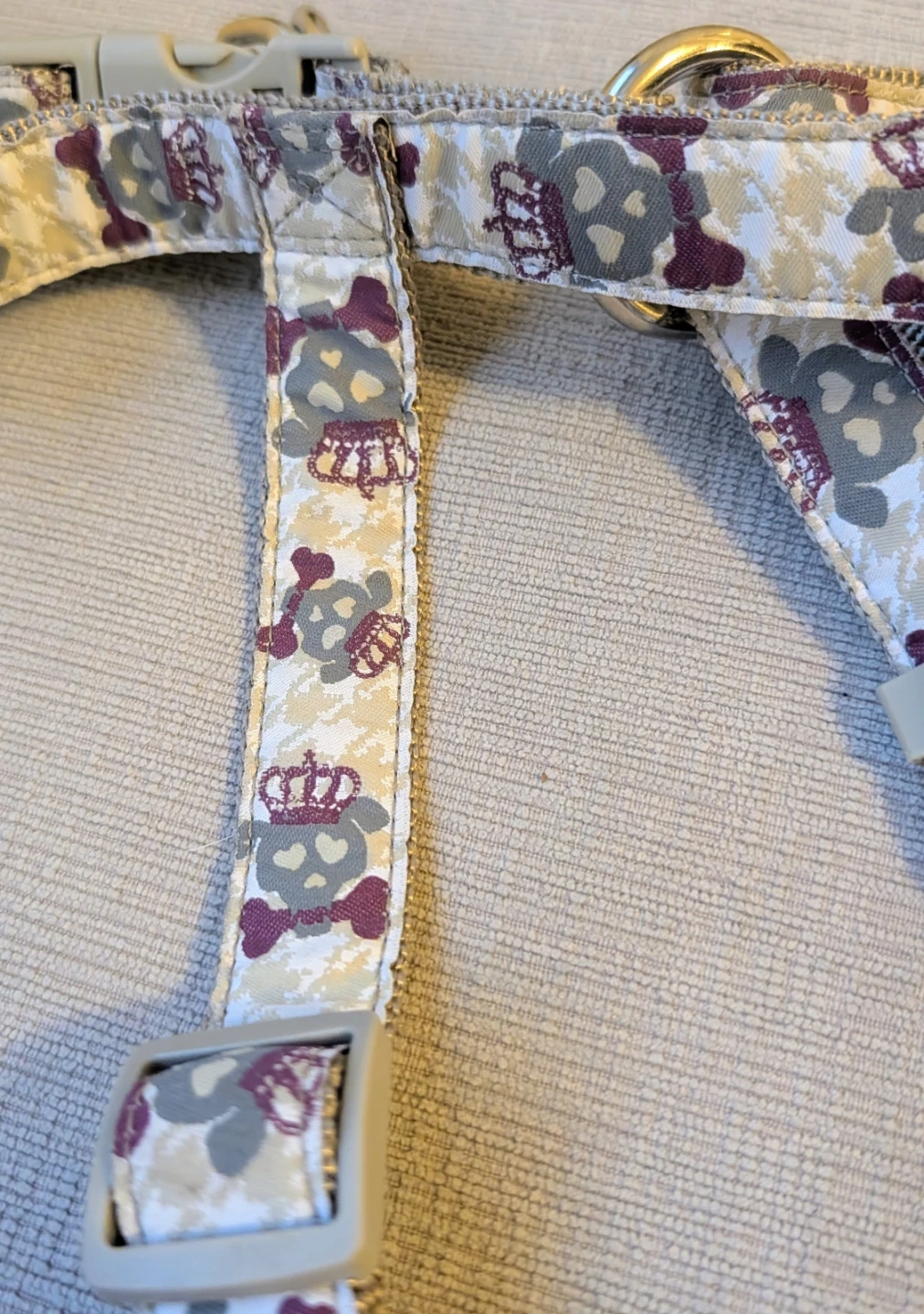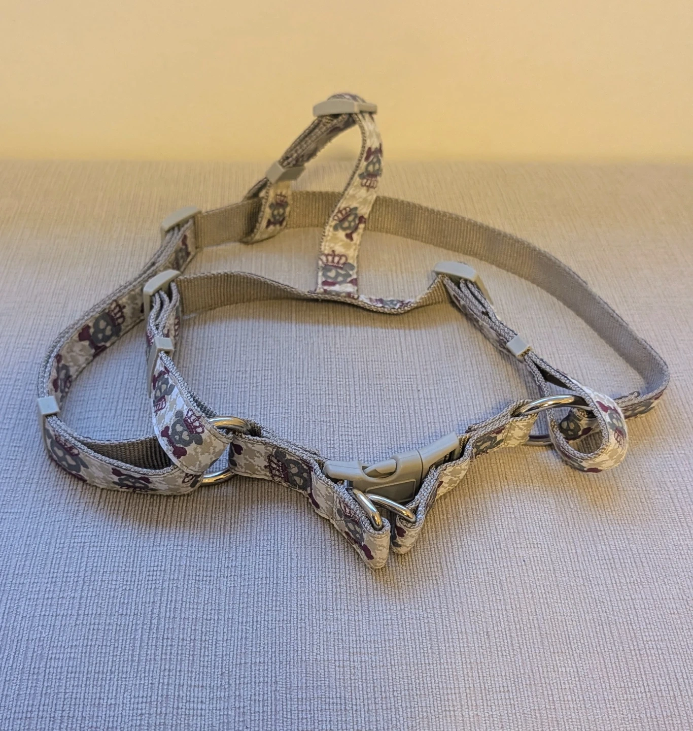 This dog harness features a fun skull and crown print. It's made with durable nylon webbing and has adjustable straps for a comfortable fit. Multiple D-rings are present for leash attachment.
