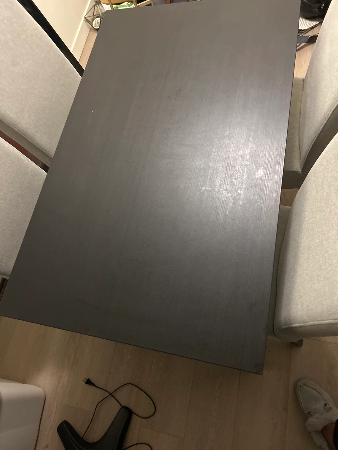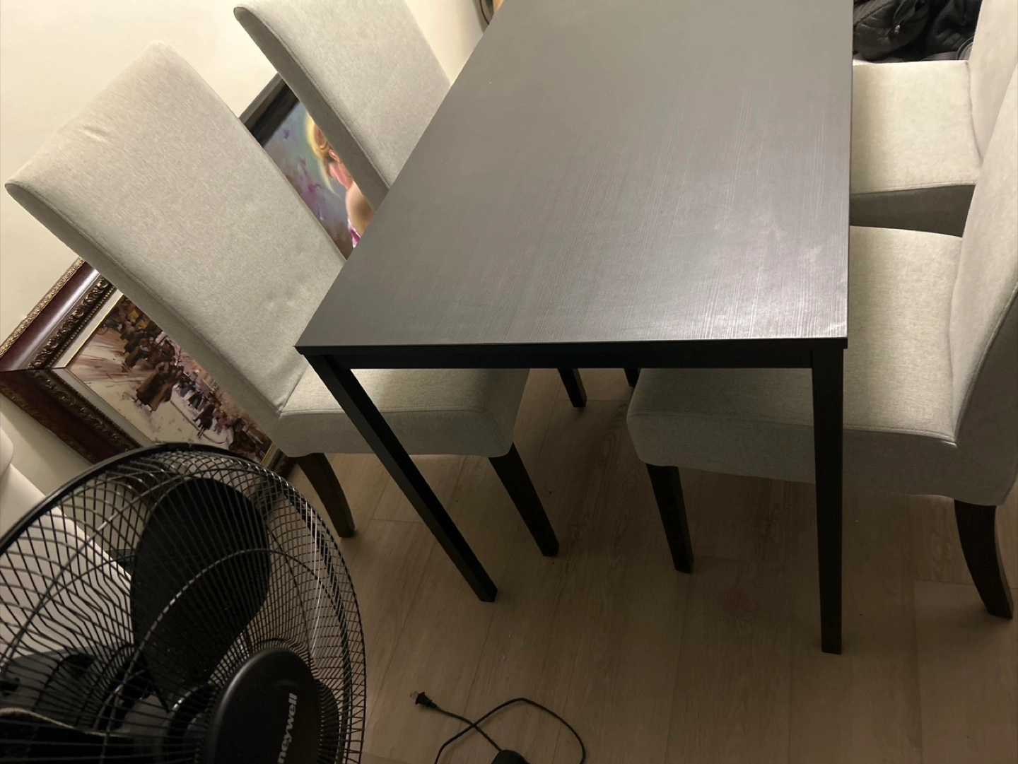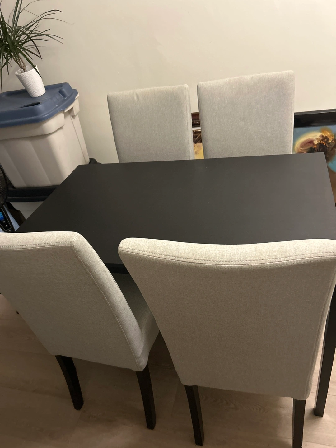 A black dining table with 4 light grey upholstered chairs. Tabletop is black wood. Chairs have wooden legs.