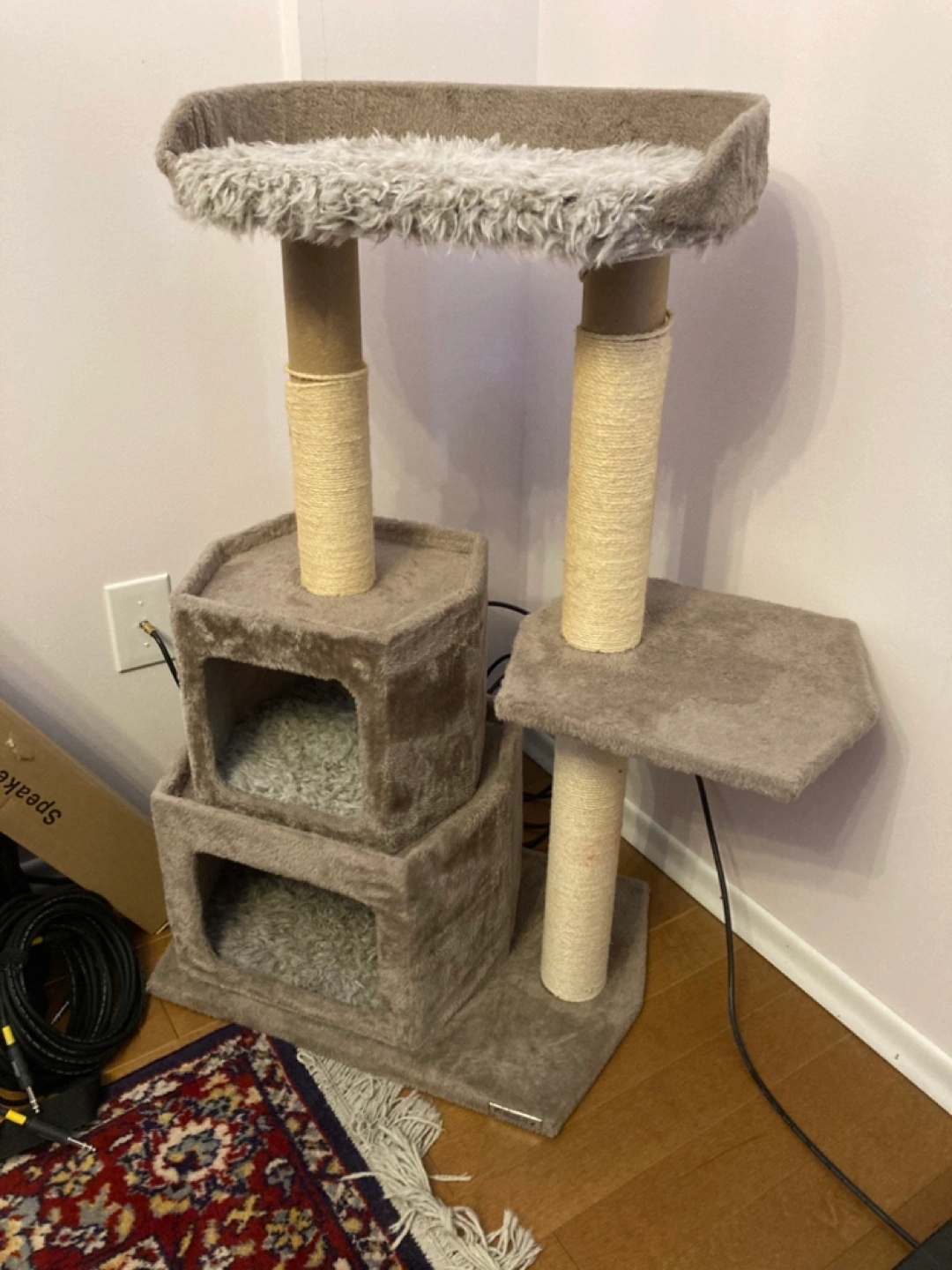 Multi-level cat tree, in good condition but missing some sisal on two of the scratching posts.