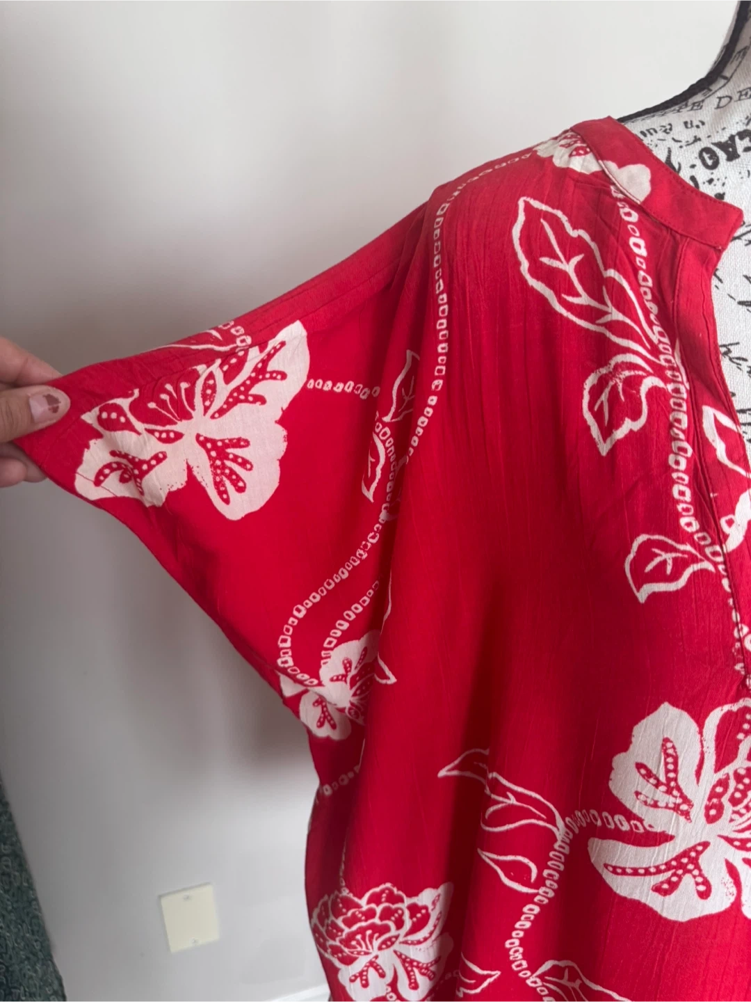 A bright red tunic top with a white floral print. It has short sleeves and a V-neckline with a slight Henley opening. The fabric looks lightweight and breathable.
