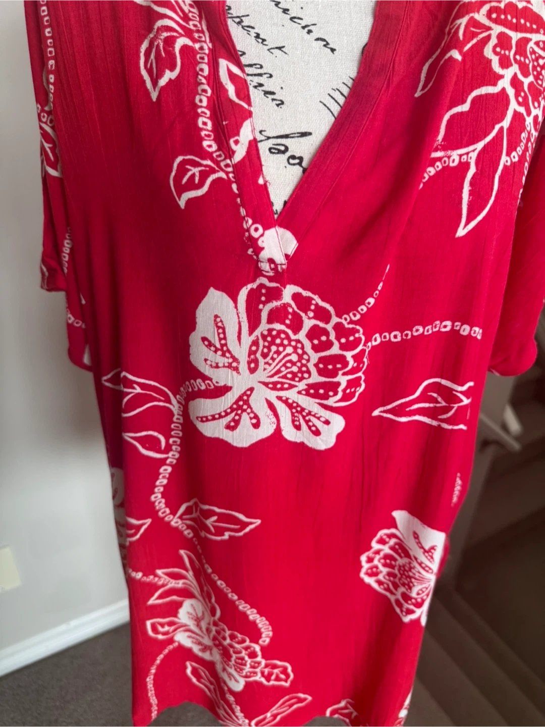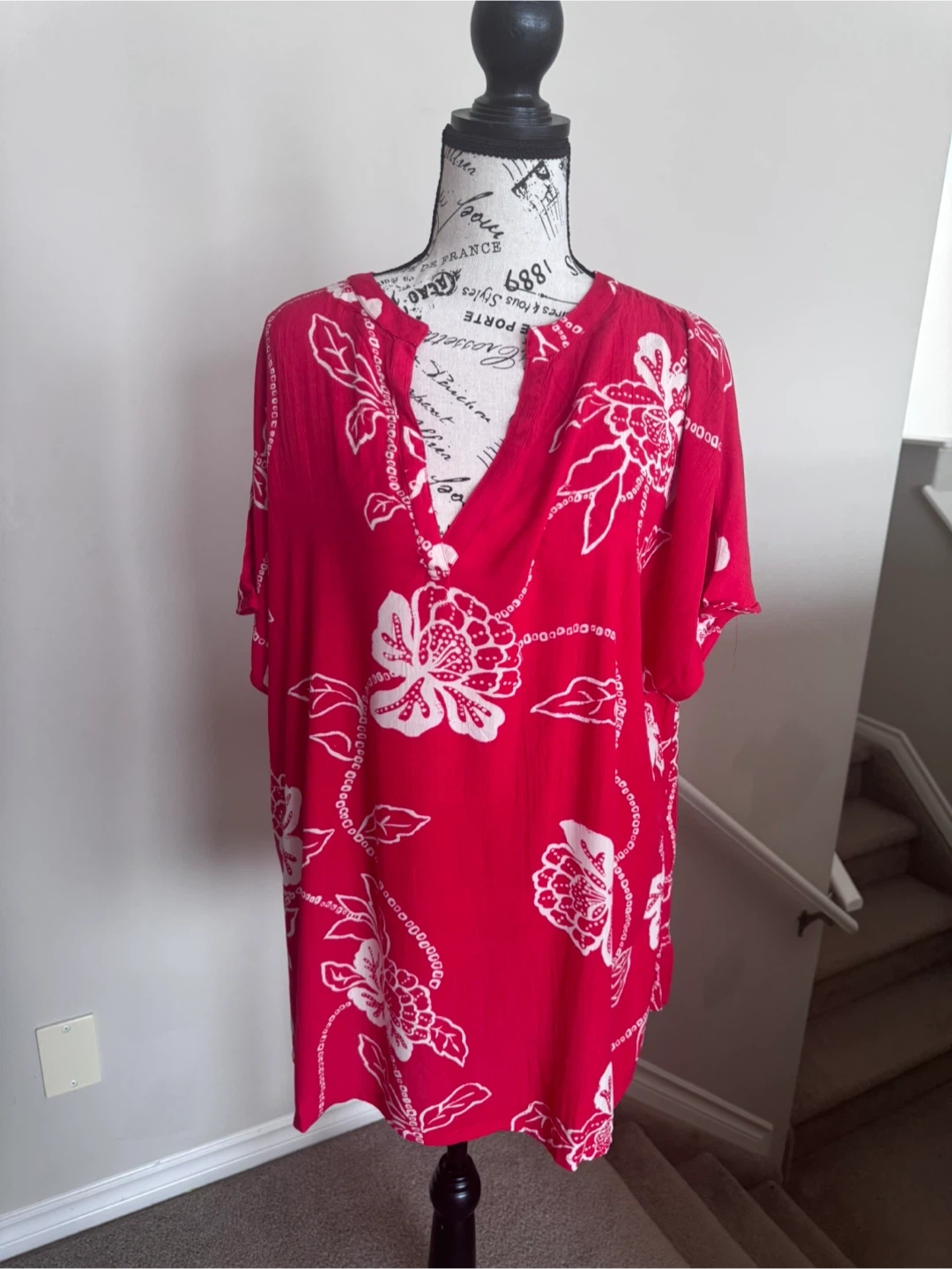 A bright red tunic top with a white floral print. It has short sleeves and a V-neckline with a slight Henley opening. The fabric looks lightweight and breathable.