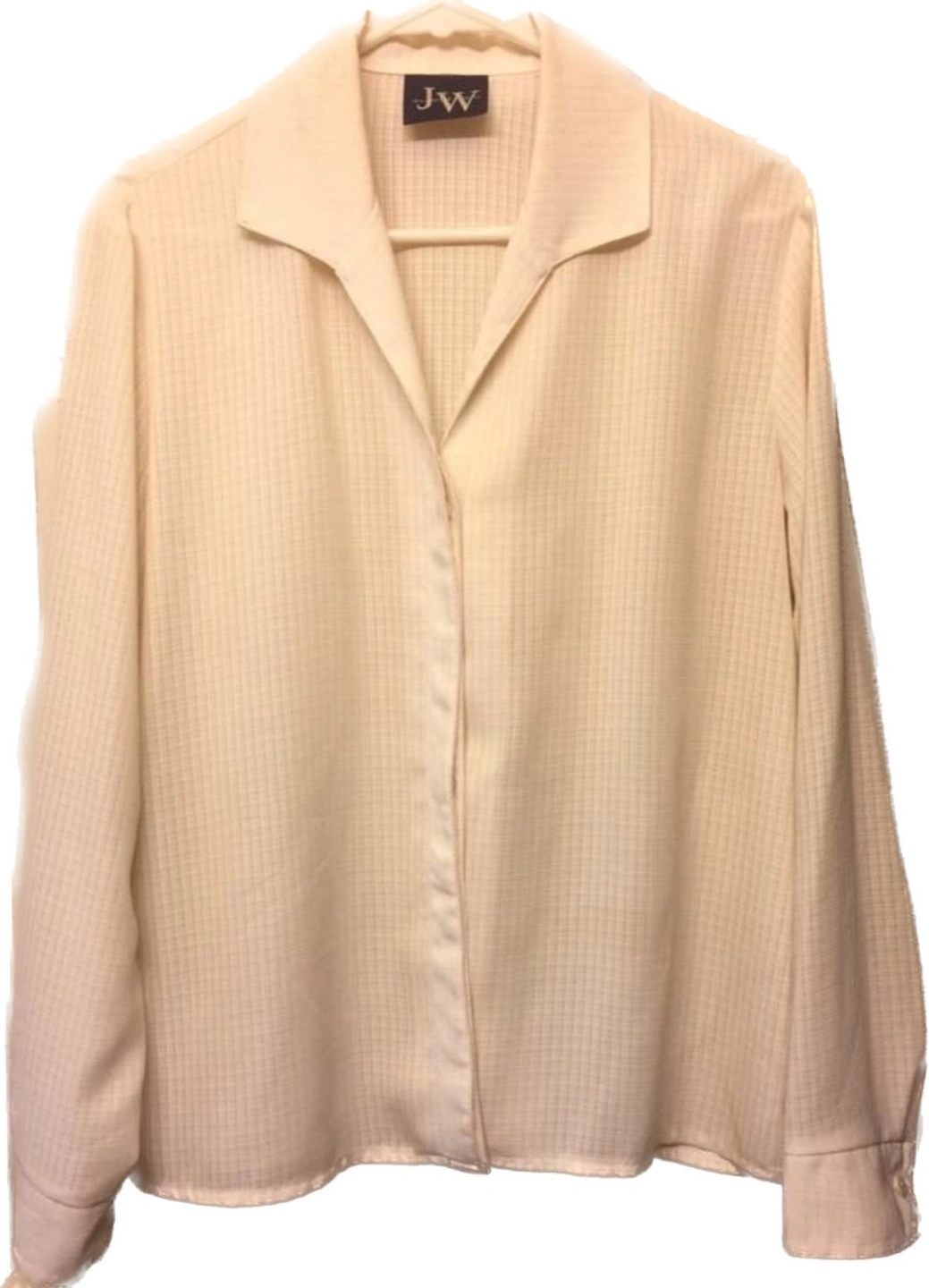Long-sleeve button-up blouse. Cream coloured, subtle grid pattern. Relaxed fit. Size L
