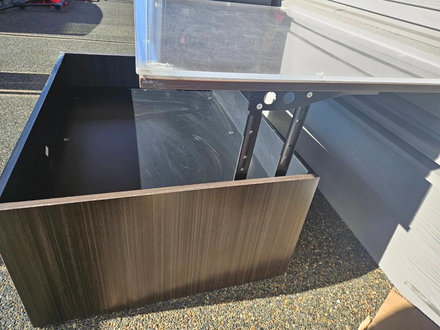 Dark wood coffee table with glass top. Has a two‑section lower shelf for storage. Clean, modern style and still in good condition. Ideal for living room, condo, or office use