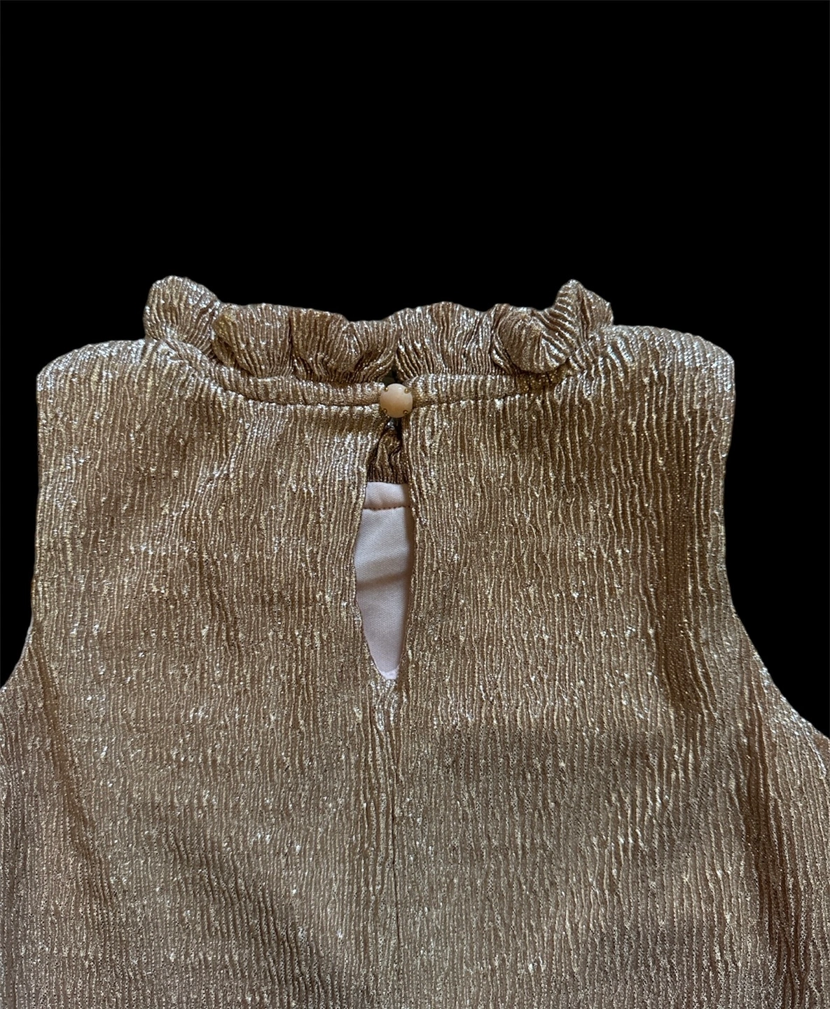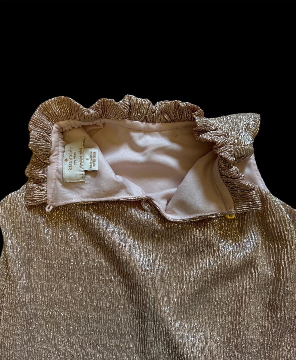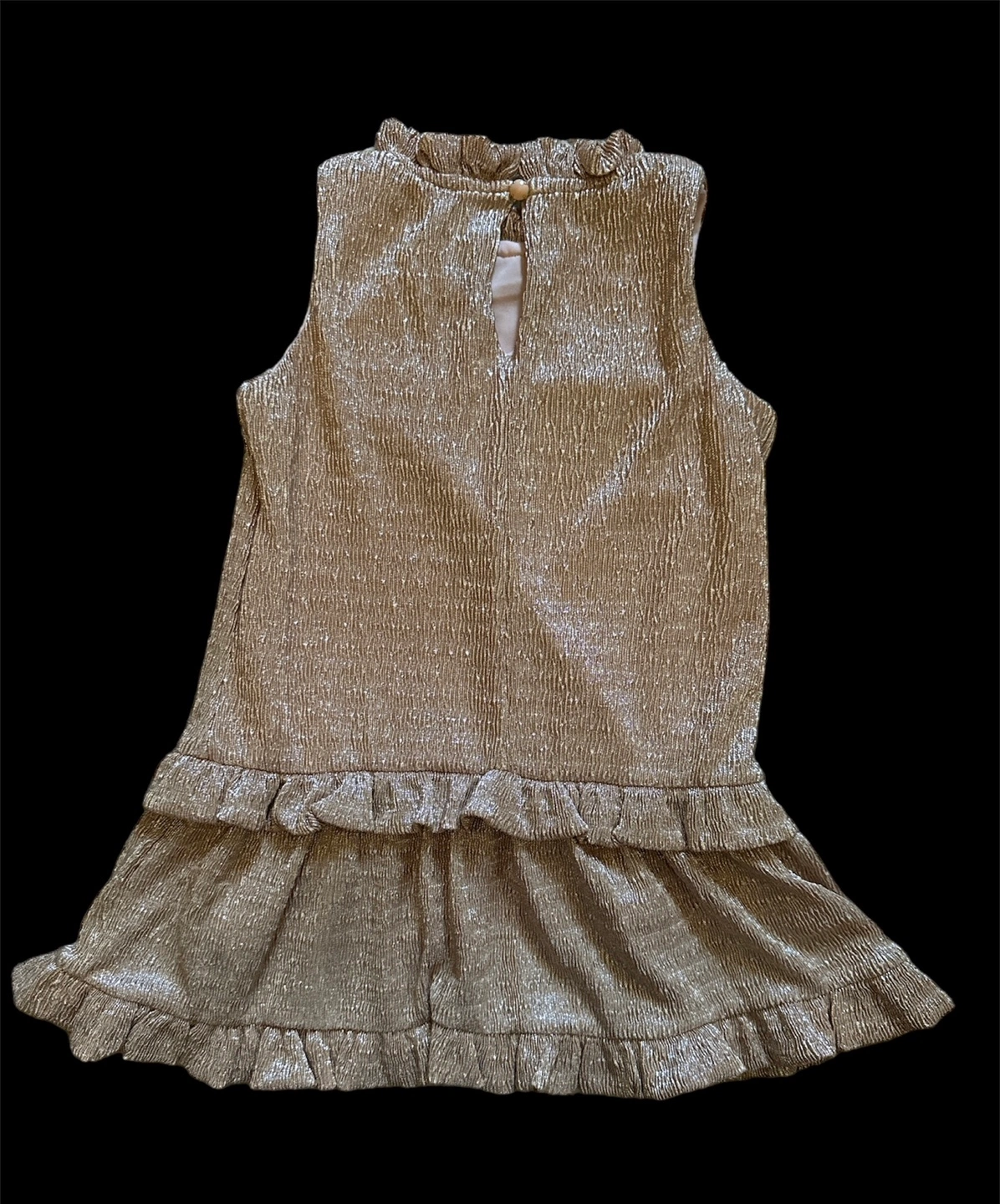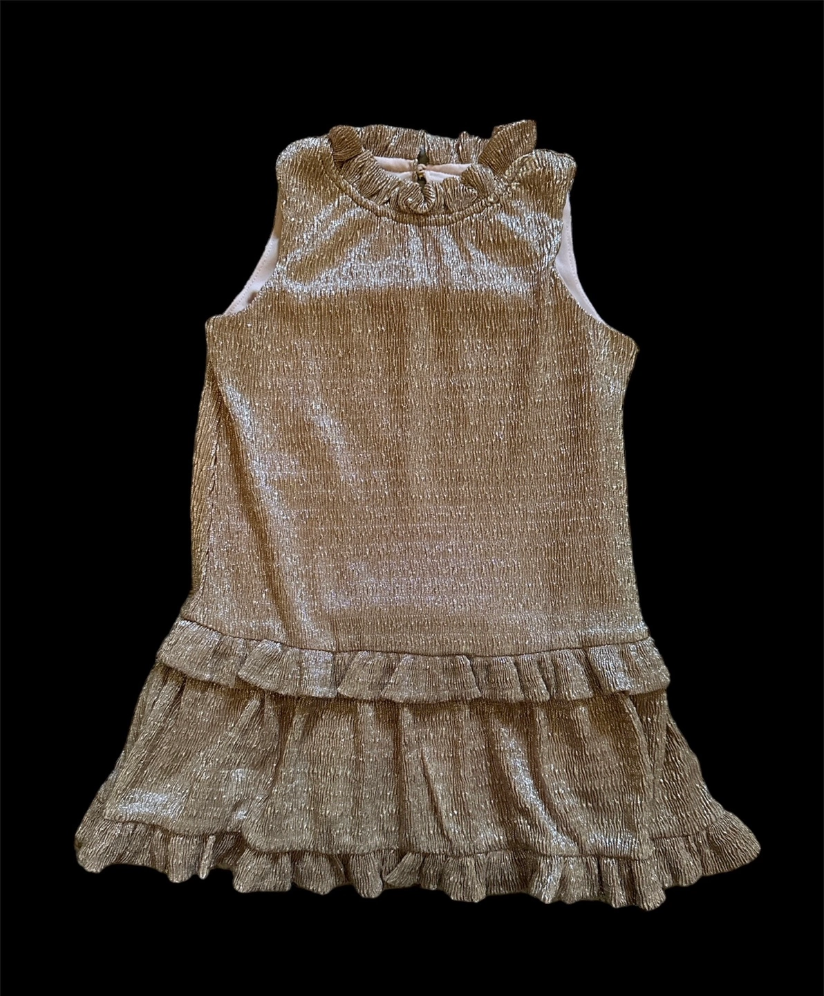 Gold metallic dress with a ruffled neckline and two tiers of ruffles at the bottom. Sleeveless. Size 3T
