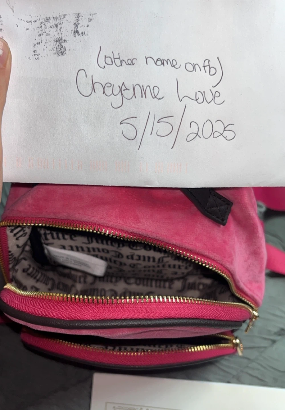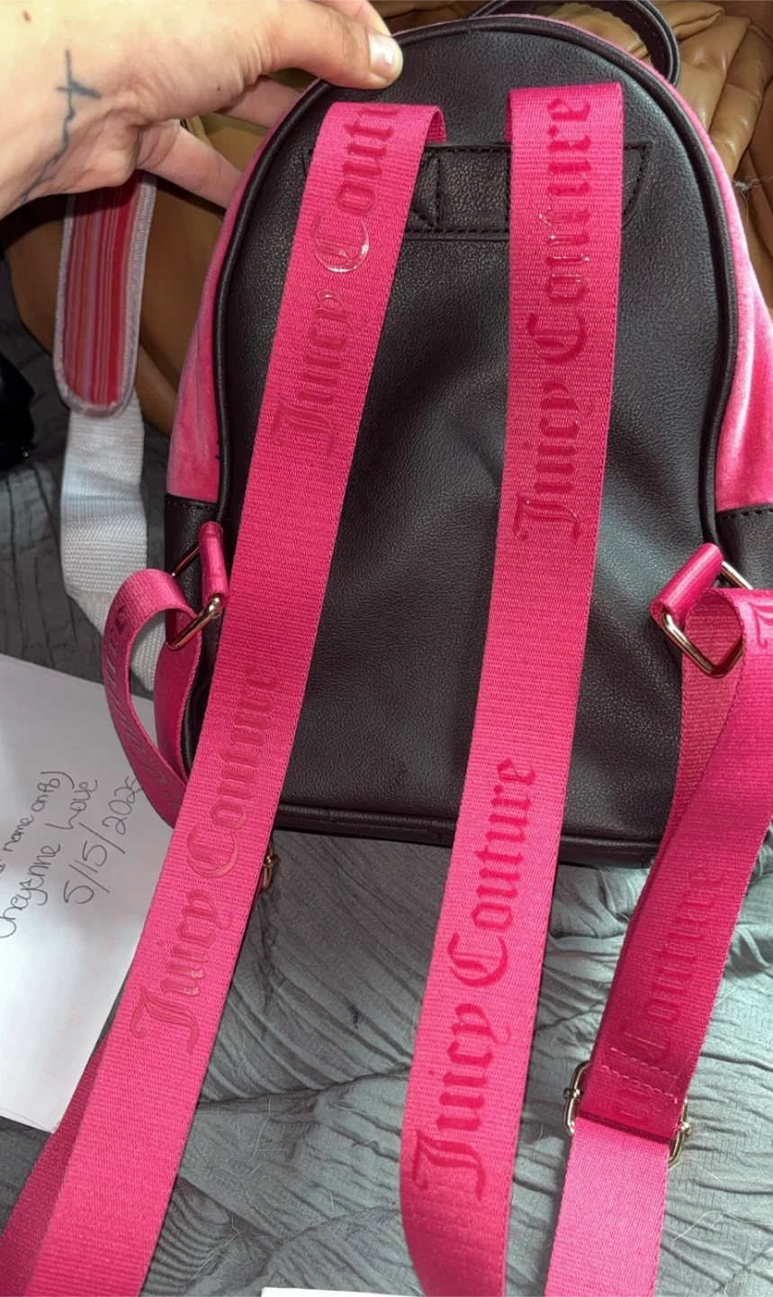 This is a Juicy Couture backpack. It's made of soft pink velour material. It has adjustable straps and a front zip pocket. This backpack is a fun accessory for everyday use!