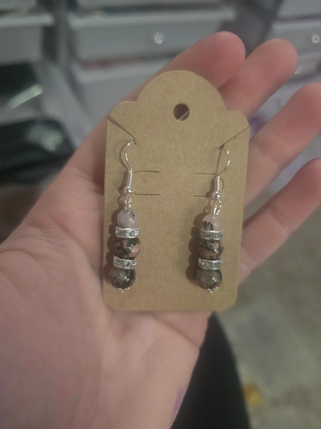 pink rhodonite gemstone beads with silver spacers. These earrings are hung on silver-toned fishhook findings. They're lightweight and would make a nice everyday accessory.