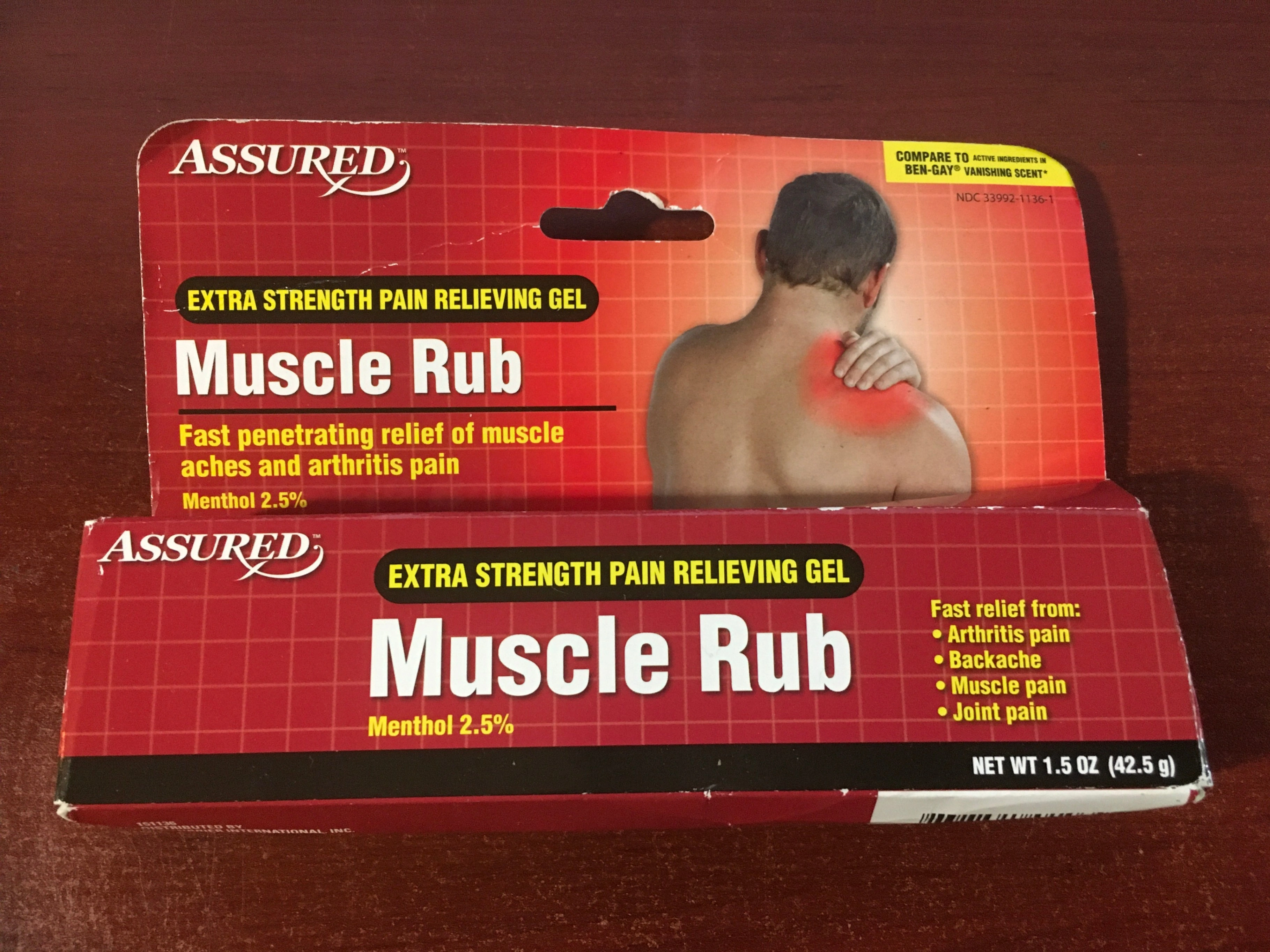 I'm selling Assured Muscle Rub, an extra strength pain relieving gel. It offers fast penetrating relief of muscle aches and arthritis pain. It contains Menthol 2.5% and provides fast relief from arthritis pain, backache, muscle pain, and joint pain. Net weight is 1.5 oz (42.5 g) expired