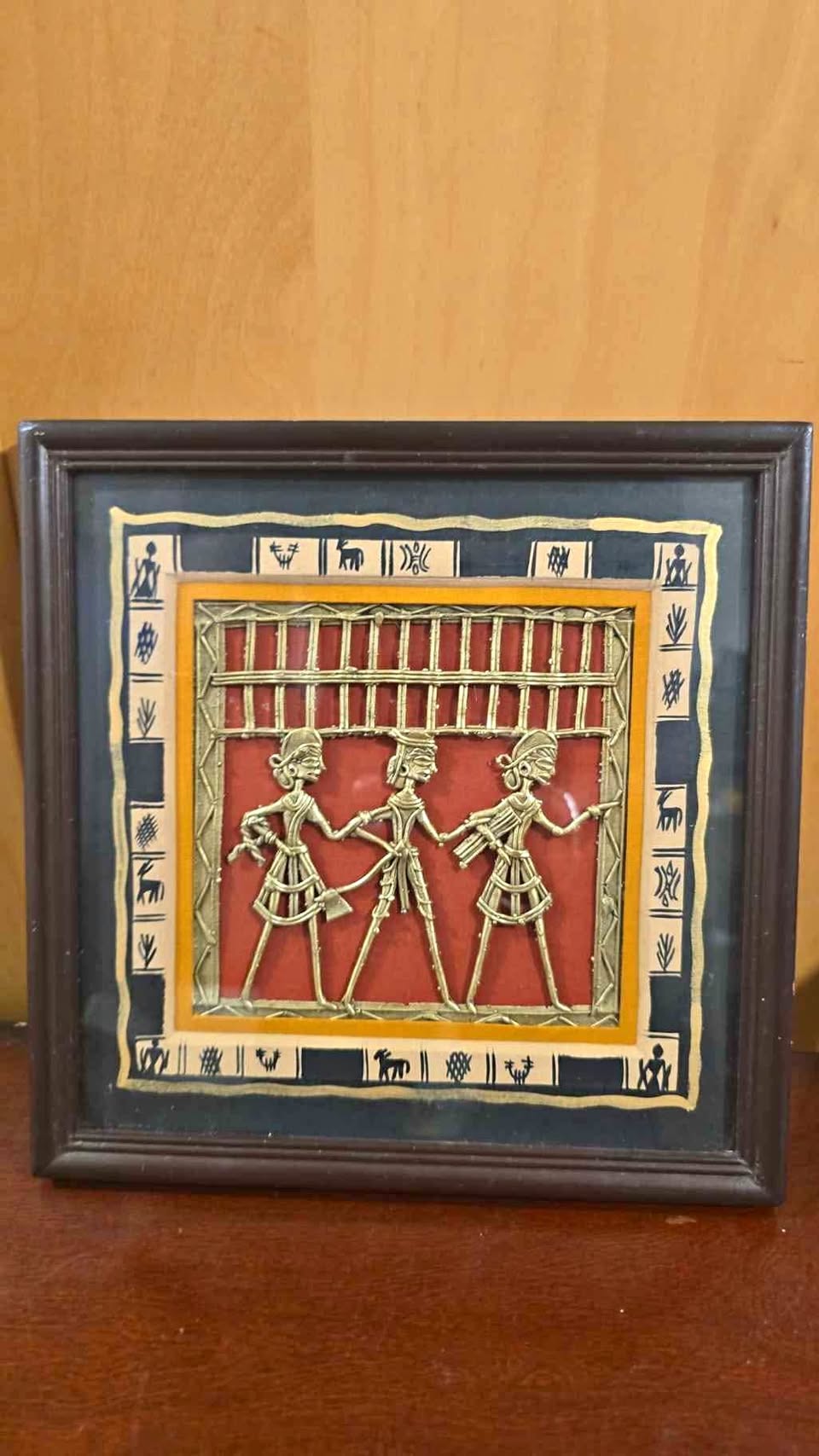Beautiful handcrafted tribal art wall hanging featuring three traditional figures made from metal on a red and orange background. Framed with a black and brown wooden border and ready to hang (wire attached on the back). Adds a cultural and rustic touch to any space.