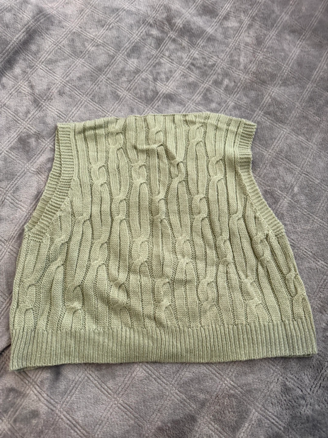 slightly cropped Light green cable knit vest with a V-neck. Sleeveless design. This vest's knit pattern adds a touch of texture. Had it for a while and never wore.