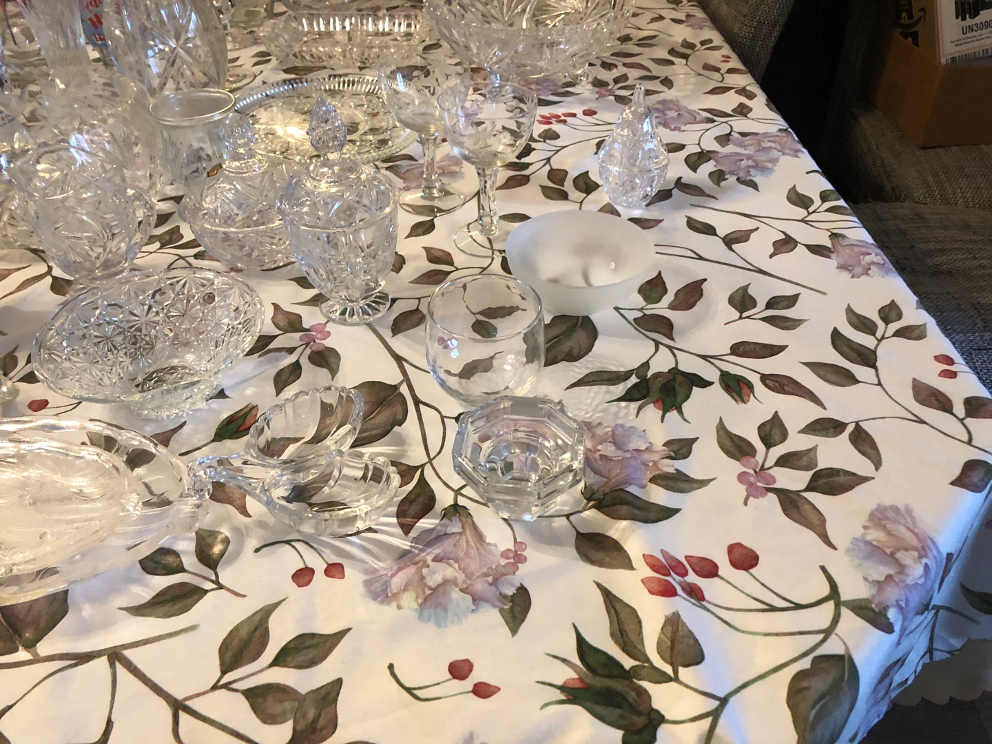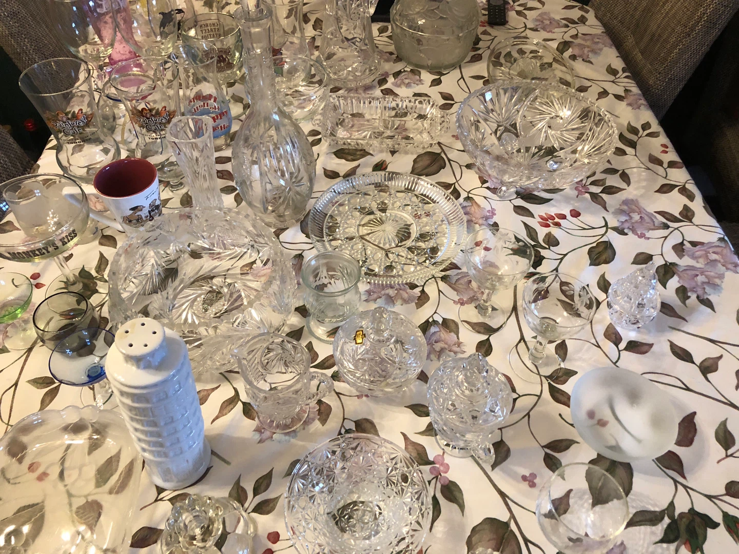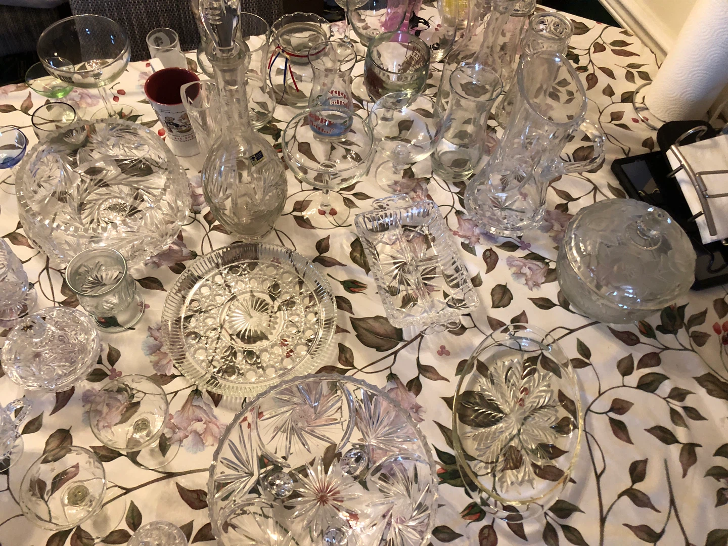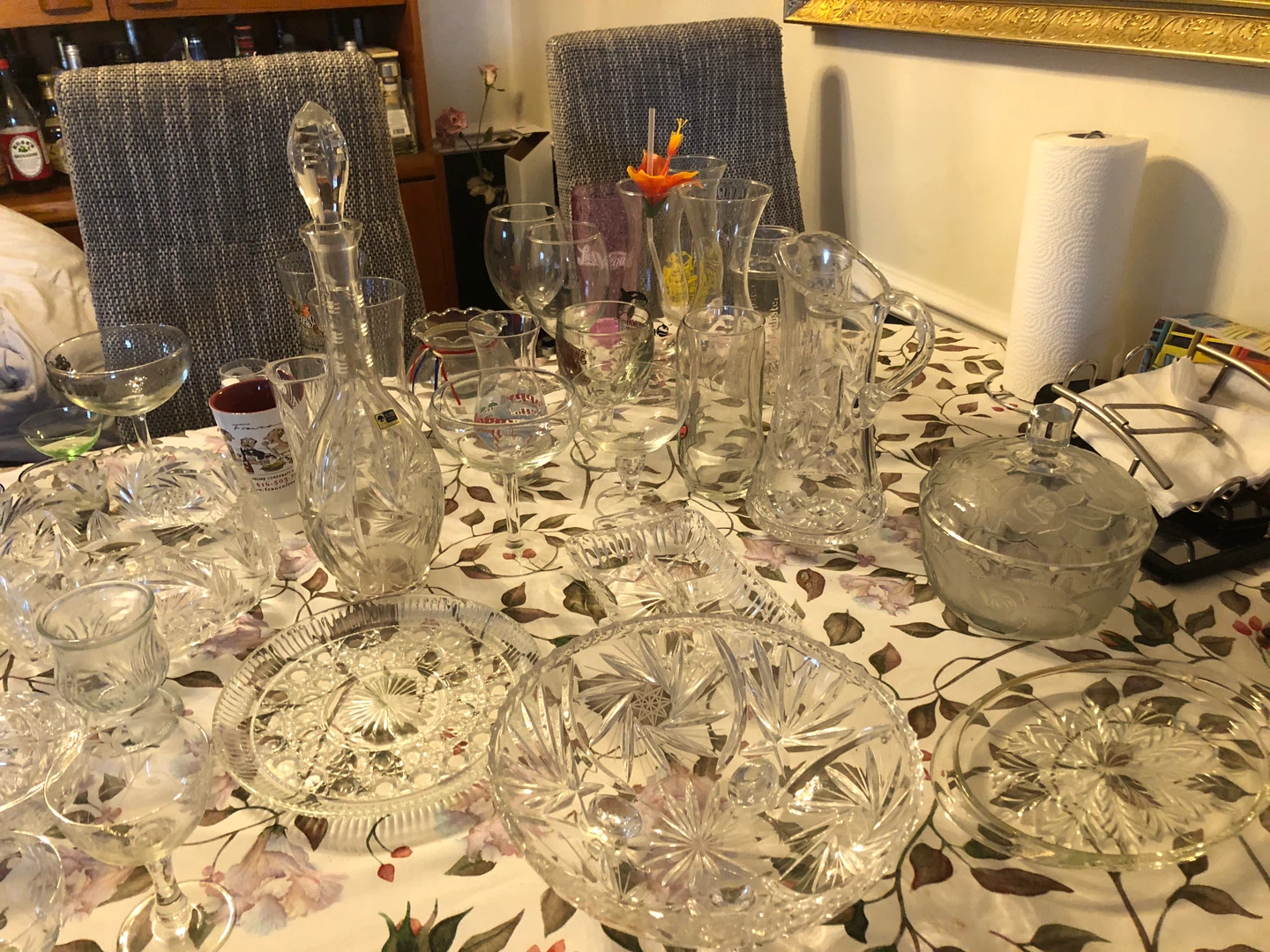 Selling a collection of various crystal glassware pieces. There's a variety of items including bowls, plates, glasses, and pitchers, all with intricate designs. Perfect for adding a touch of elegance to your dining or display cabinet!