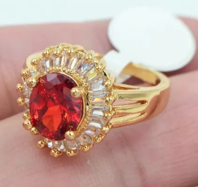 This gold-tone ring features a striking red oval-cut center stone surrounded by a halo of smaller clear baguette and round-cut stones. It's set in a decorative gold-tone band. This ring is suitable for formal occasions or everyday wear.