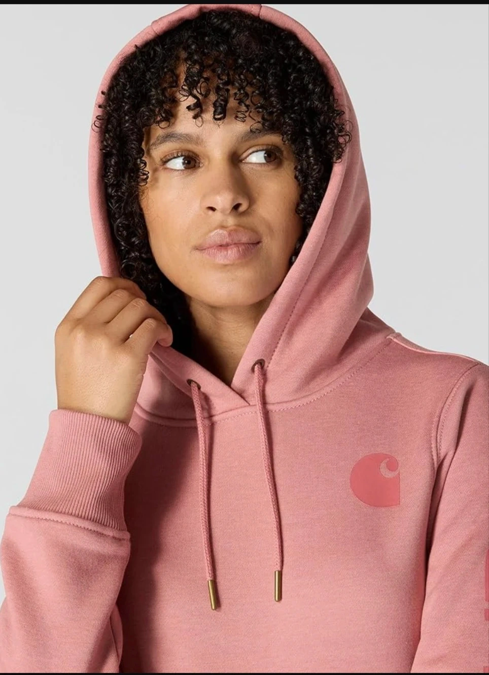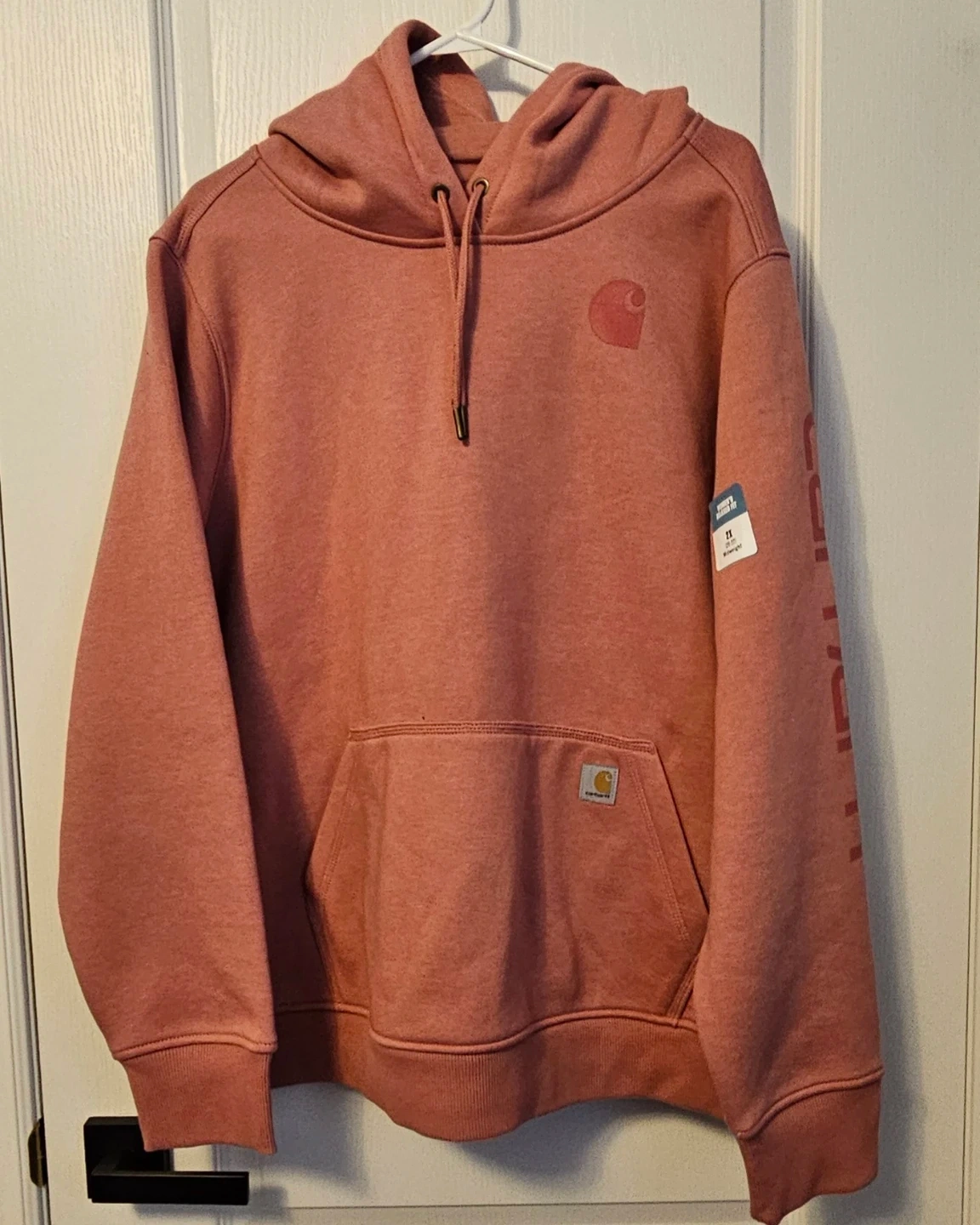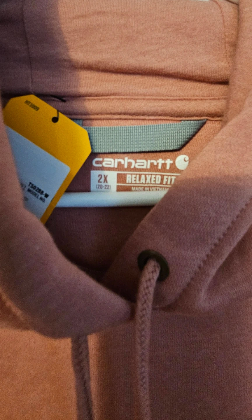 Carhartt hooded sweatshirt in a size 2X(20-22). Relaxed fit construction. Features a kangaroo pocket and Carhartt logo on left sleeve & front